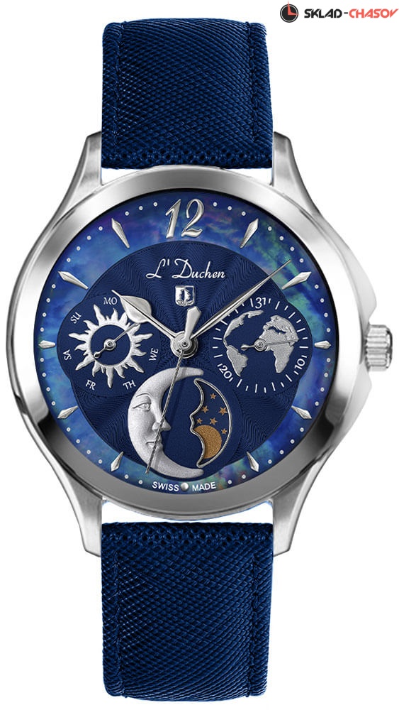 Выразительный аксессуар, дополненный необходимыми функциями, станет прекрасным продолжением стильного образа. Женские часы с круглым стальным корпусом Celeste. Гильошированный циферблат с перламутровой вставкой украшен фирменным логотипом L'Duchen в виде дубового листа – символа мудрости и долговечности. Метки в виде штрихов и арабской цифры 12. Число и день недели вынесены на отдельные циферблаты. Указатель фаз Луны находится в положении 6 часов. Рифленая заводная головка с защитой. Кожаный ремешок с раскладывающейся застежкой.