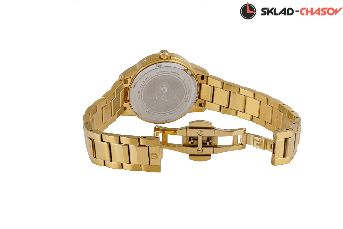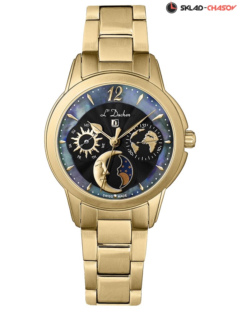 Кварцевый швейцарский механизм надежно скрыт в стальном 34-миллиметровом корпусе круглой формы с PVD-покрытием из желтого золота. Привлекает внимание сочетание матированных и полированных элементов на корпусе. Широкий полированный безель интересно играет на свету. Почти невидимое, но стойкое к появлению царапин, сапфировое стекло позволяет любоваться главной изюминкой модели — роскошным черным циферблатом. Центральная часть циферблата декорирована волнообразным гильоше. Индикатор дней недели представлен в виде солнечного диска, индикатор даты украшает изображение карты нашей планеты. Указатель лунных фаз элегантно выделен металлической рамкой и дополнен объемным элементом в виде месяца. И, конечно, неповторимость и уникальность часам придает кольцо из натурального перламутра по краю циферблата. Часы установлены на браслет из нержавеющей стали со стальной раскладной застежкой «бабочка», украшенной логотипом бренда. День недели и месяц устанавливаются с помощью скрытой кнопки, которая находится сбоку на корпусе. Разработчики предусмотрительно расположили ее таким образом, чтобы механизм часов не был поврежден в результате случайного и некорректного использования кнопки.