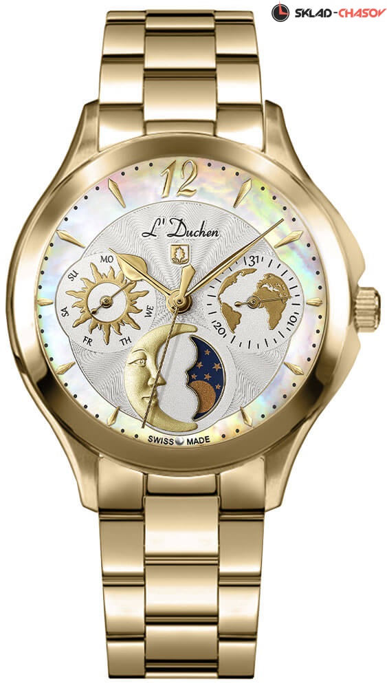 Женские часы Petit Celeste с круглым стальным корпусом. Гильошированный циферблат с перламутровой вставкой украшен фирменным логотипом L'Duchen в виде дубового листа – символа мудрости и долговечности. Метки в виде штрихов и арабской цифры 12. Число и день недели вынесены на отдельные циферблаты. Указатель фаз Луны находится в положении 6 часов. Рифленая заводная головка с защитой. Надежный стальной браслет с раскладывающейся застежкой.