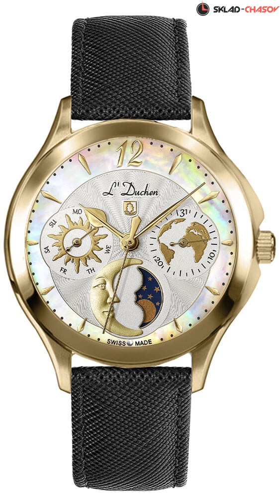 Женские часы Petit Celeste с круглым стальным корпусом. Гильошированный циферблат с перламутровой вставкой украшен фирменным логотипом L'Duchen в виде дубового листа – символа мудрости и долговечности. Метки в виде штрихов и арабской цифры 12. Число и день недели вынесены на отдельные циферблаты. Указатель фаз Луны находится в положении 6 часов. Рифленая заводная головка с защитой. Удобный кожаный ремешок с раскладывающейся застежкой.