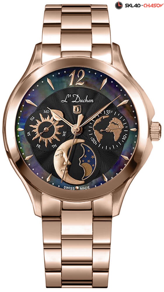 Женские часы Petit Celeste с круглым стальным корпусом. Гильошированный циферблат с перламутровой вставкой украшен фирменным логотипом L'Duchen в виде дубового листа – символа мудрости и долговечности. Метки в виде штрихов и арабской цифры 12. Число и день недели вынесены на отдельные циферблаты. Указатель фаз Луны находится в положении 6 часов. Рифленая заводная головка с защитой. Надежный стальной браслет с раскладывающейся застежкой.