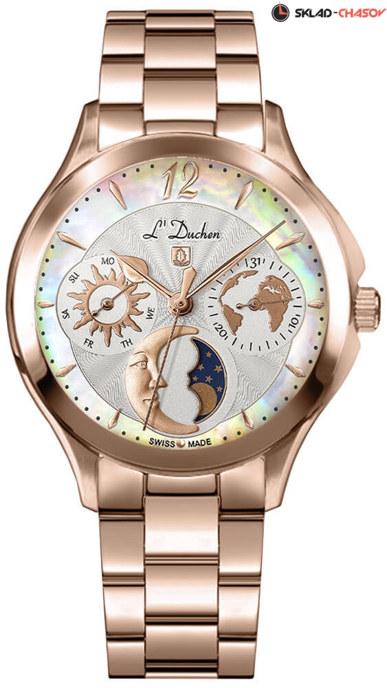Женские часы Petit Celeste с круглым стальным корпусом. Гильошированный циферблат с перламутровой вставкой украшен фирменным логотипом L'Duchen в виде дубового листа – символа мудрости и долговечности. Метки в виде штрихов и арабской цифры 12. Число и день недели вынесены на отдельные циферблаты. Указатель фаз Луны находится в положении 6 часов. Рифленая заводная головка с защитой. Надежный стальной браслет с раскладывающейся застежкой.