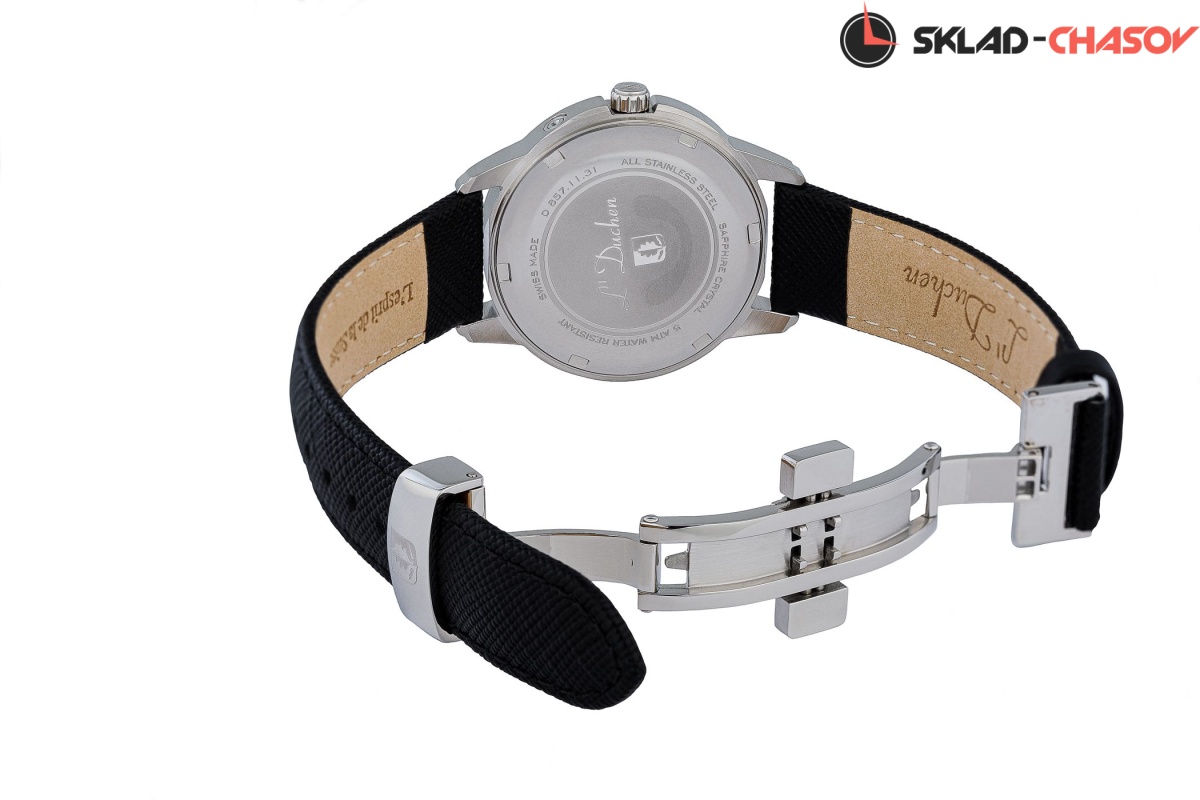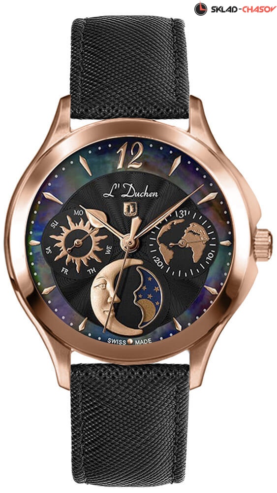 Кварцевый швейцарский механизм надежно скрыт в стальном 34-миллиметровом корпусе круглой формы с PVD-покрытием из розового золота. Привлекает внимание сочетание матированных и полированных элементов на корпусе. Широкий полированный безель интересно играет на свету. Почти невидимое, но стойкое к появлению царапин, сапфировое стекло позволяет любоваться главной изюминкой модели — роскошным черным циферблатом. Центральная часть циферблата декорирована волнообразным гильоше. Индикатор дней недели представлен в виде солнечного диска, индикатор даты украшает изображение карты нашей планеты. Указатель лунных фаз элегантно выделен металлической рамкой и дополнен объемным элементом в виде месяца. И, конечно, неповторимость и уникальность часам придает кольцо из натурального перламутра по краю циферблата. Часы установлены на черном ремешке из натуральной кожи с сафьяновым тиснением и стальной раскладной застежкой «бабочка», украшенной логотипом бренда. День недели и месяц устанавливаются с помощью скрытой кнопки, которая находится сбоку на корпусе.