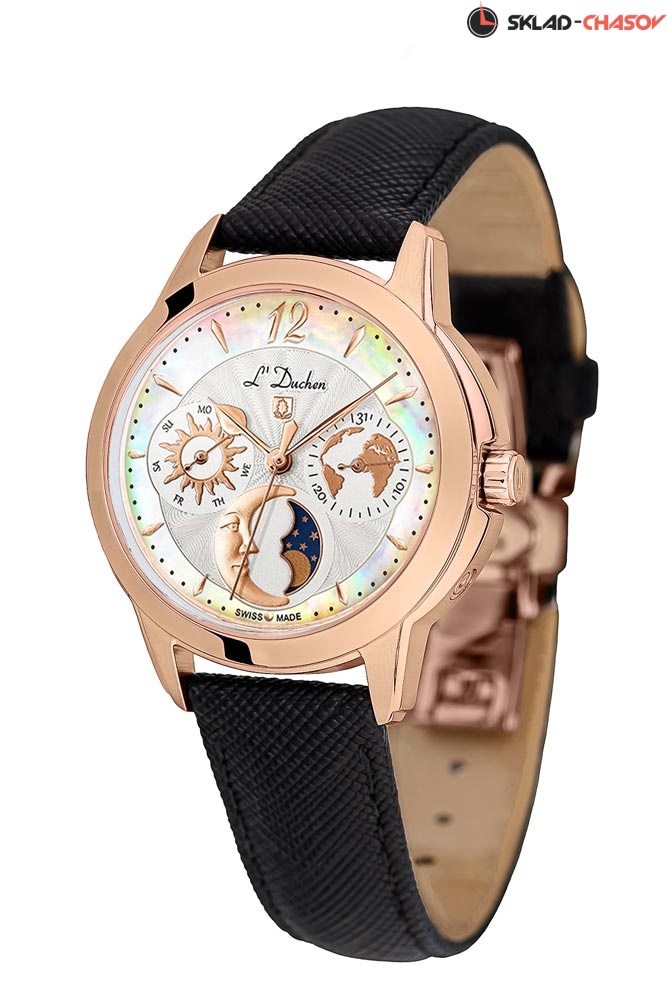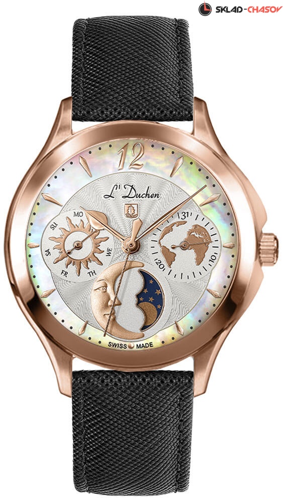Кварцевый швейцарский механизм надежно скрыт в стальном 34-миллиметровом корпусе круглой формы с PVD-покрытием из розового золота. Привлекает внимание сочетание матированных и полированных элементов на корпусе. Широкий полированный безель интересно играет на свету. Почти невидимое, но стойкое к появлению царапин, сапфировое стекло позволяет любоваться главной изюминкой модели — роскошным белым циферблатом. Центральная часть циферблата декорирована волнообразным гильоше. Индикатор дней недели представлен в виде солнечного диска, индикатор даты украшает изображение карты нашей планеты. Указатель лунных фаз элегантно выделен металлической рамкой и дополнен объемным элементом в виде месяца. И, конечно, неповторимость и уникальность часам придает кольцо из натурального перламутра по краю циферблата. Часы установлены на черном ремешке из натуральной кожи с сафьяновым тиснением и стальной раскладной застежкой «бабочка», украшенной логотипом бренда. День недели и месяц устанавливаются с помощью скрытой кнопки, которая находится сбоку на корпусе.