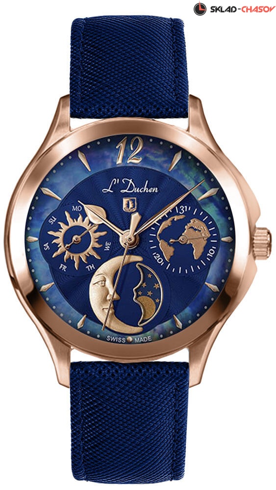 Кварцевый швейцарский механизм надежно скрыт в стальном 34-миллиметровом корпусе круглой формы с PVD-покрытием из розового золота. Привлекает внимание сочетание матированных и полированных элементов на корпусе. Широкий полированный безель интересно играет на свету. Почти невидимое, но стойкое к появлению царапин, сапфировое стекло позволяет любоваться главной изюминкой модели — роскошным синим циферблатом. Центральная часть циферблата декорирована волнообразным гильоше. Индикатор дней недели представлен в виде солнечного диска, индикатор даты украшает изображение карты нашей планеты. Указатель лунных фаз элегантно выделен металлической рамкой и дополнен объемным элементом в виде месяца. И, конечно, неповторимость и уникальность часам придает кольцо из натурального перламутра по краю циферблата. Часы установлены на синем ремешке из натуральной кожи с сафьяновым тиснением и стальной раскладной застежкой «бабочка», украшенной логотипом бренда. День недели и месяц устанавливаются с помощью скрытой кнопки, которая находится сбоку на корпусе.
