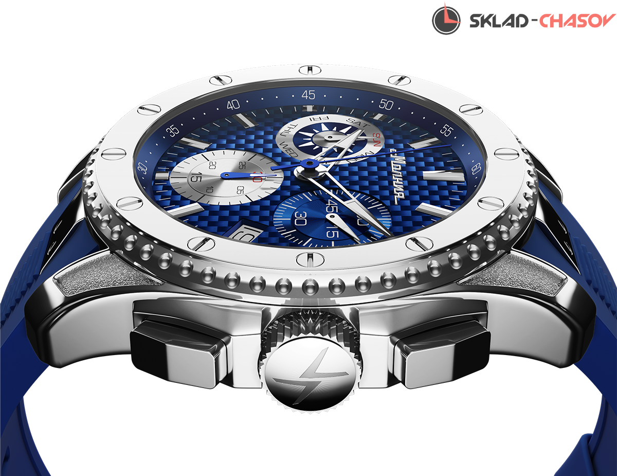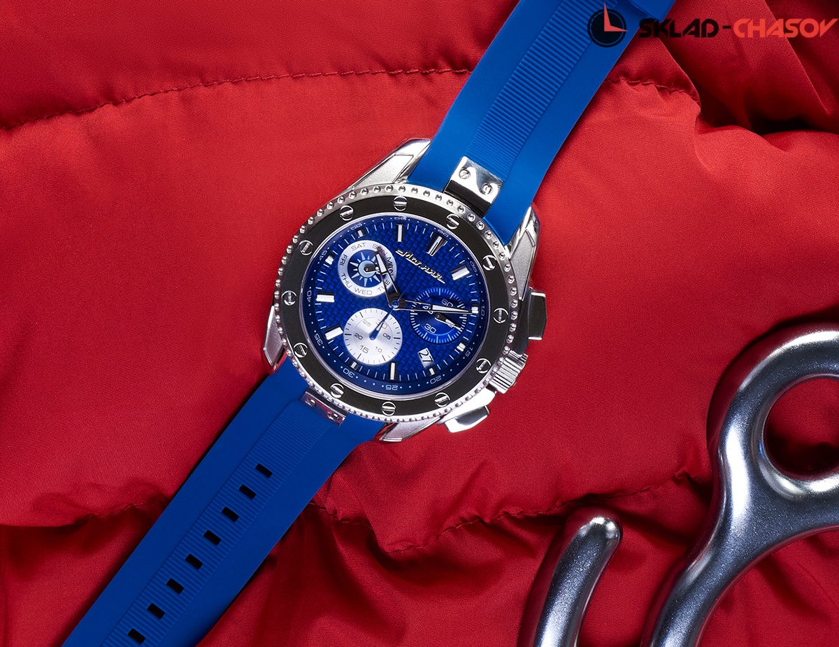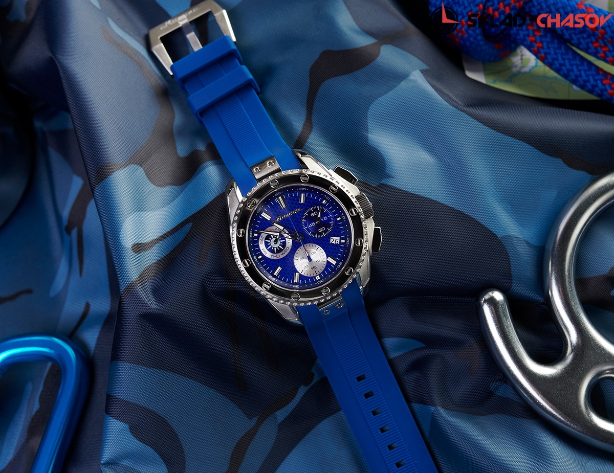 Массивный корпус с крупным фактурным циферблатом привлекает внимание. Комфортные, функциональные и стильные, эти часы подойдут тем, кто с утра спешит на деловую встречу, а вечером садится в самолет, чтобы провести выходные на гребне волны. Швейцарский кварцевый механизм не подведет в любом часовом поясе, карбоновый циферблат прослужит много лет, а силиконовый ремешок будет крепко, но мягко держаться на руке.