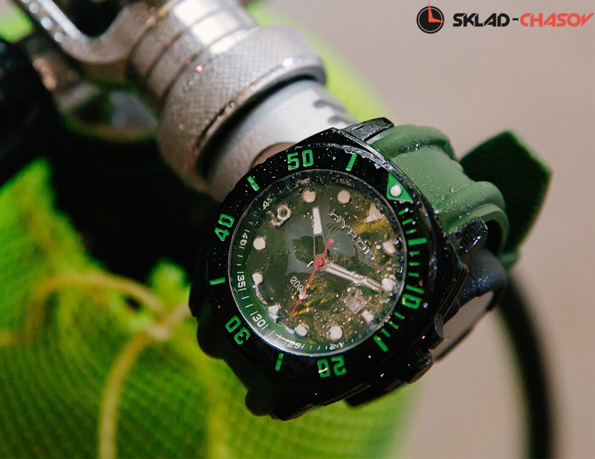 Устойчивое к повреждениям сапфировое стекло, завинчивающаяся заводная головка, водонепроницаемость до 200 метров – все это позволяет назвать данную модель поистине универсальной и незаменимой при освоении морских глубин.