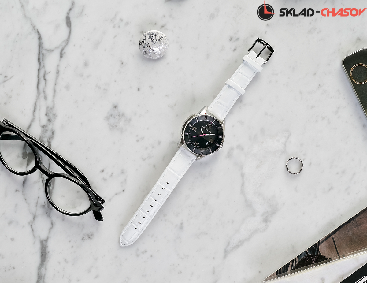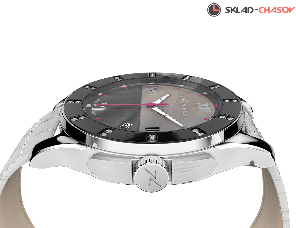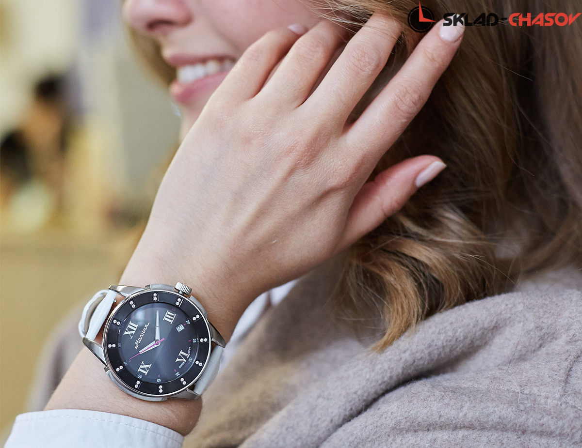 Яркая и женственная модель – результат сотрудничества российских часовщиков и швейцарских дизайнеров. В оформлении двусоставного циферблата использован натуральный перламутр, безель украшен кристаллами циркона, что выгодно оттеняет геометрию корпуса. Часы могут меняться вместе с вашими предпочтениями: кожаный ремешок сделает модель более деликатной, а дополнительный силиконовый браслет добавит образу спортивный характер. К этим часам прилагаются два ремешка в комплекте, кожаный и силиконовый.