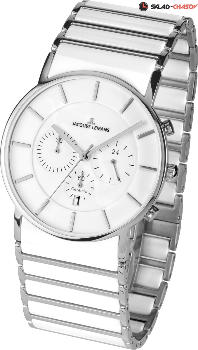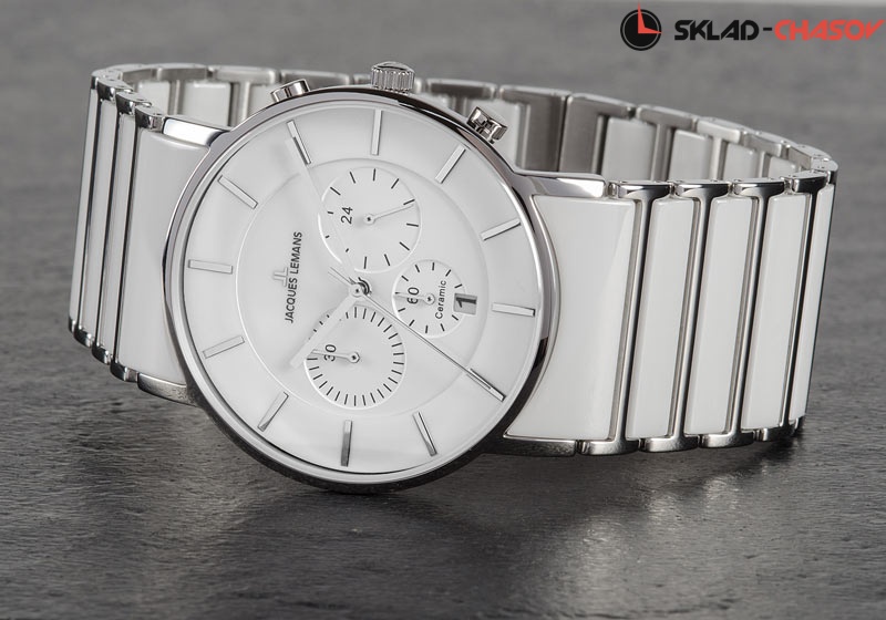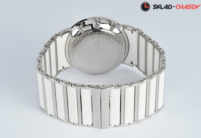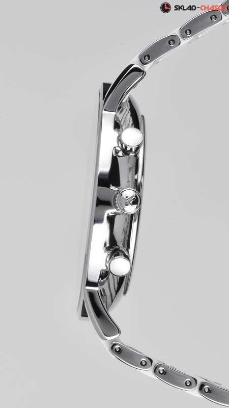Кварцевый мужской хронограф отличается тонким корпусом из стали. На циферблате расположены индикаторы 24-часов, 30-минутный накопитель, вынесенная секундная стрелка и дата. Небольшой размер кнопок хронографа и заводной головки подчеркивают элегантность модели. Центральные звенья браслета выполнены из высокотехнологичной керамики белого цвета. Этот стойкий к появлению микроцарапин материал позволяет на долгое время сохранить превосходный внешний вид часов, а использование стальных звеньев по бокам браслета увеличивает его прочность. В часах установлено сапфировое стекло.