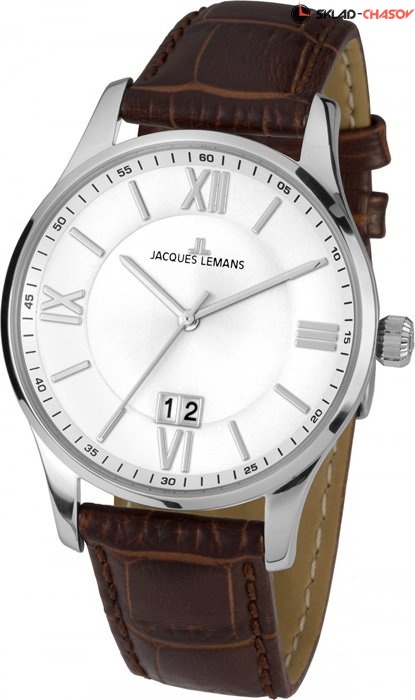 Классические часы в корпусе из нержавеющей стали диаметром 40 мм. Тонкий полированный безель обрамляет белый циферблат с крупными рисками и римскими цифрами. В позиции «6 часов» расположен индикатор «большой даты». В кварцевой модели установлено ударопрочное минеральное стекло Crystex. Повышенная водостойкость составляет 10 атмосфер. Плотный ремешок выполнен из натуральной кожи коричневого цвета. Часы Jacques Lemans серии London — универсальный аксессуар, подходящий для любого вашего образа, в любой ситуации.