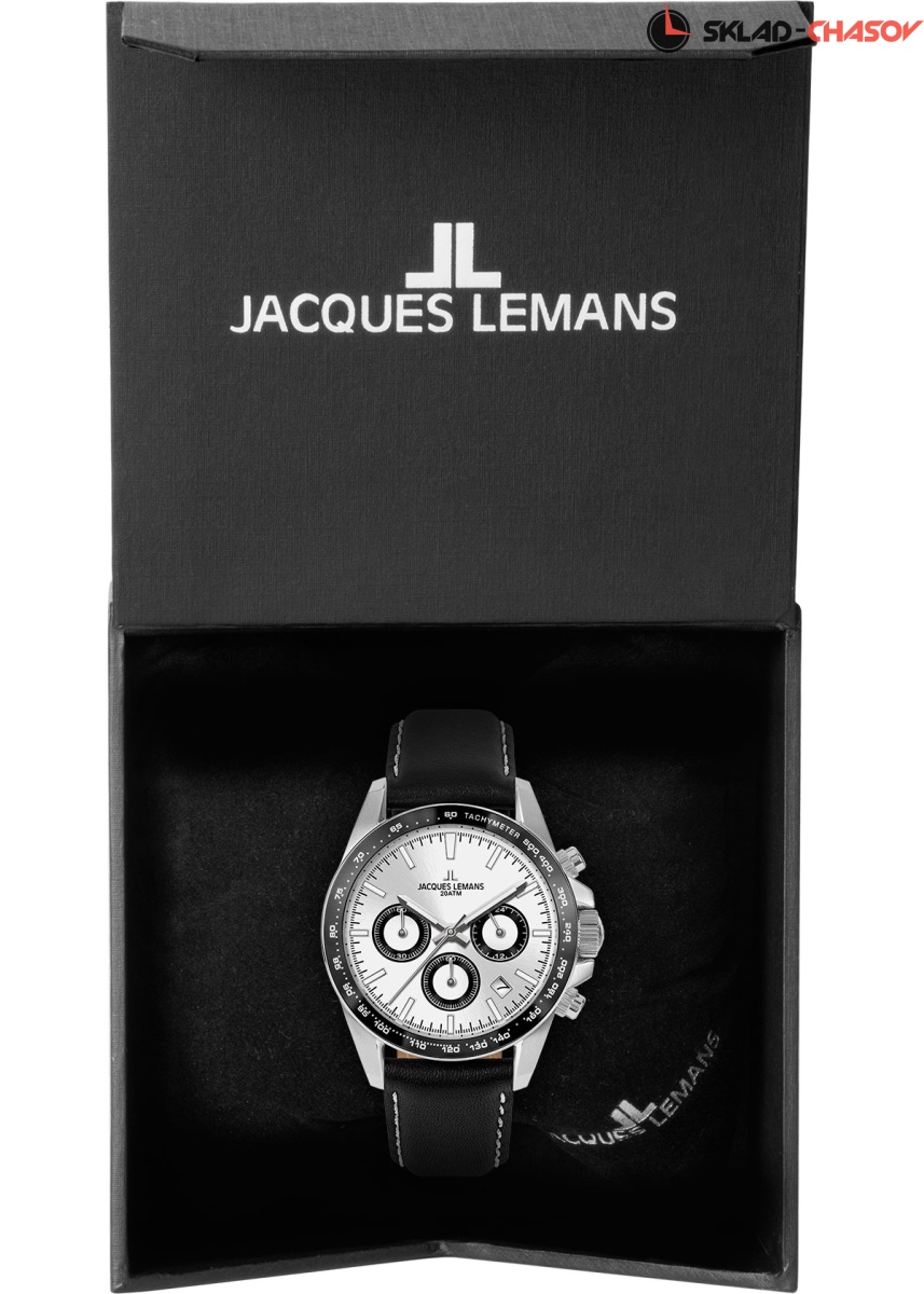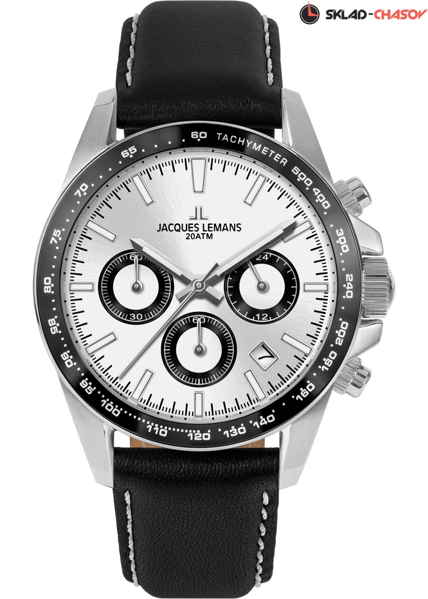 Кварцевые часы в спортивном стиле с повышенной водостойкостью 20 атмосфер. Крупный 41-миллиметровый корпус сделан из нержавеющей стали. Этот прочный материал известен, также, своими гипоаллергенными свойствами. На широкий безель нанесена тахиметрическая шкала. На белом циферблате выделяются хорошо читаемые центральные стрелки часов и минут с люминесцентным покрытием. Предусмотрены дополнительные индикаторы: минутный и секундный накопители и индикатор 24-х часов. Между 4 и 5 часами — окошко даты. В модели установлено ударопрочное минеральное стекло Crystex. Повышенная водостойкость в 20 атмосфер обеспечивается завинчивающимися заводной головкой и крышкой. Ремешок черного цвета из натуральной кожи дополнен прошивкой, что повышает его стойкость к износу. Функциональные и эффектные, часы Jacques Lemans станут вашим надежным помощником как в офисе, так и во время занятий спортом.
