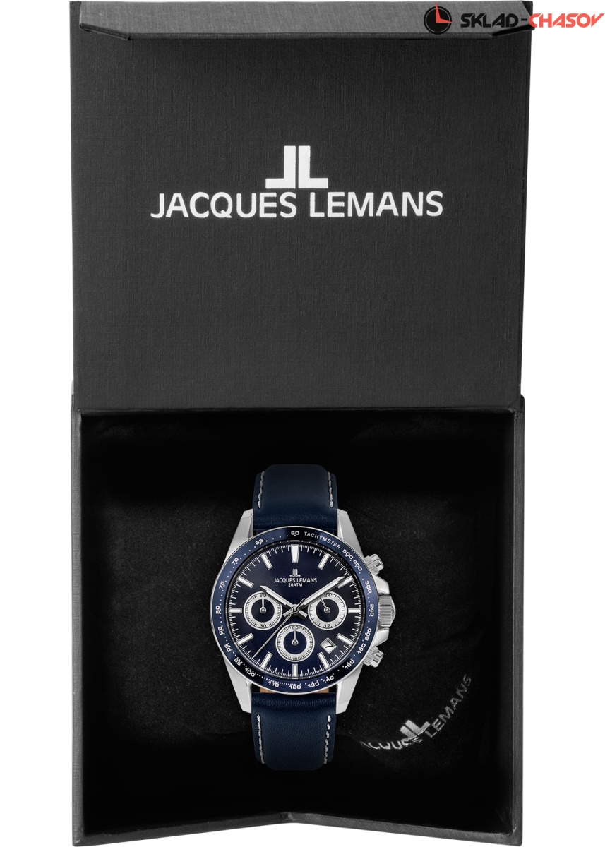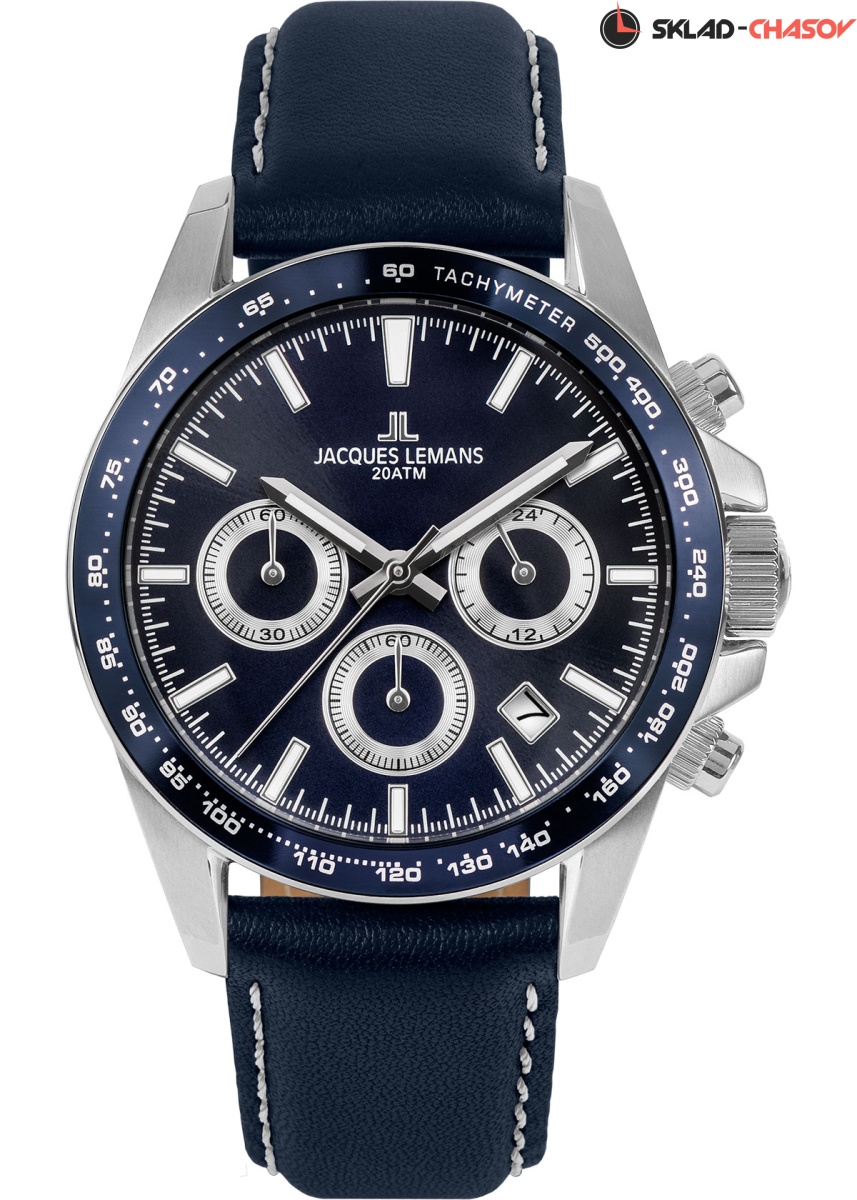 Кварцевые часы в спортивном стиле с повышенной водостойкостью 20 атмосфер. Крупный 41-миллиметровый корпус сделан из нержавеющей стали. Этот прочный материал известен, также, своими гипоаллергенными свойствами. На широкий безель нанесена тахиметрическая шкала. На синем циферблате выделяются хорошо читаемые центральные стрелки часов и минут с люминесцентным покрытием. Предусмотрены дополнительные индикаторы: минутный и секундный накопители и индикатор 24-х часов. Между 4 и 5 часами — окошко даты. В модели установлено ударопрочное минеральное стекло Crystex. Повышенная водостойкость в 20 атмосфер обеспечивается завинчивающимися заводной головкой и крышкой. Ремешок синего цвета из натуральной кожи дополнен прошивкой, что повышает его стойкость к износу. Функциональные и эффектные, часы Jacques Lemans станут вашим надежным помощником как в офисе, так и во время занятий спортом.