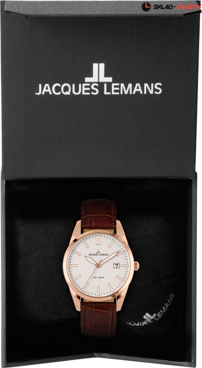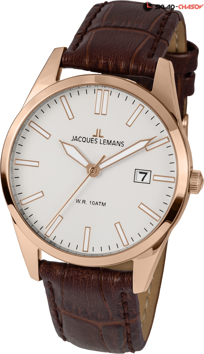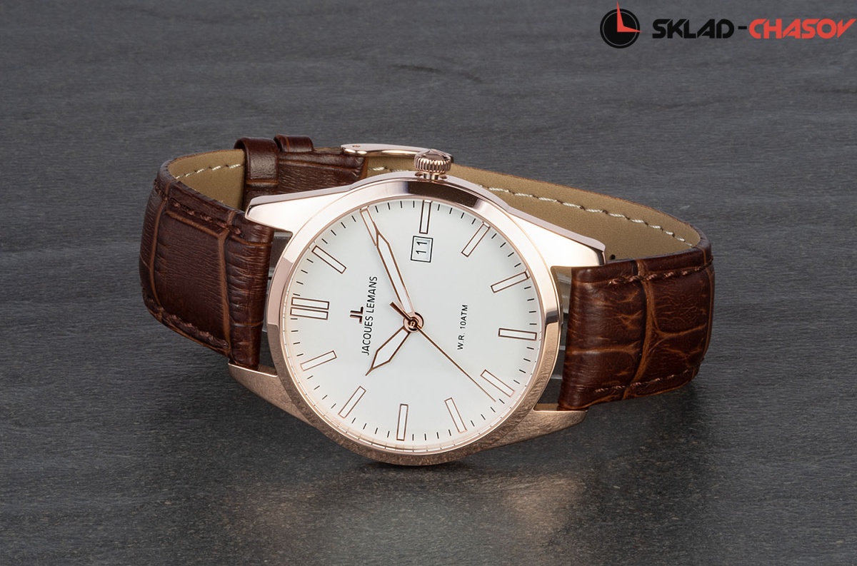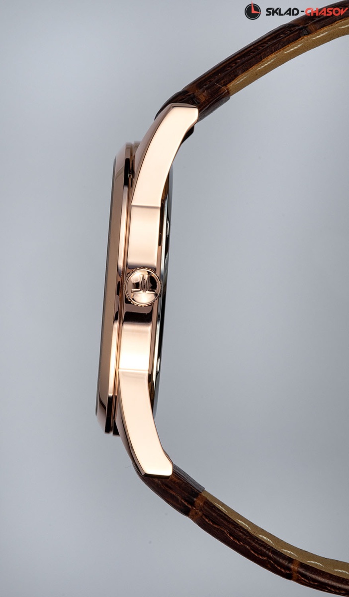 Круглый стальной корпус мужских часов коллекции Classic скрывает надежный и высокоточный японский кварцевый механизм. Нержавеющую сталь дополняет PVD-покрытие из розового золота. На белом циферблате располагается четкая индикация в виде рисок и дополнительный индикатор даты. В модели установлены хорошо-читаемые стрелки со свето-накопительным покрытием. Водостойкость часов составляет 10 АТМ. Модель можно приобрести на темно-коричневом ремешке из натуральной кожи с прошивкой.