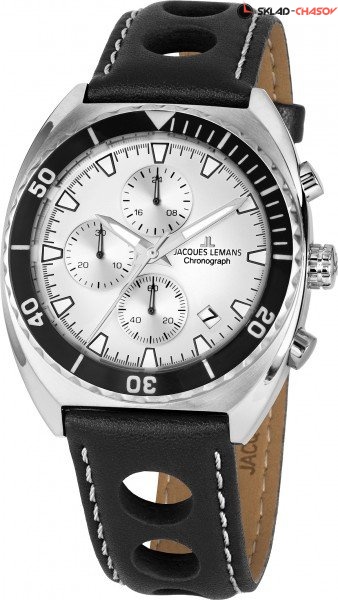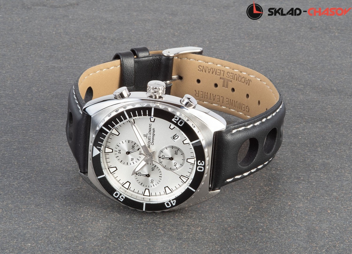 Корпус хронографа оригинальной формы сделан из нержавеющей стали. Его украшает рельефный безель с удобной измерительной шкалой. На белом циферблате три дополнительных индикатора (минутный, секундный накопители, индикатор 24-х часов) и окошко даты. Ударопрочное стекло надежно защищает циферблат, а завинчивающаяся задняя крышка модели поддерживает повышенную водостойкость 10 атмосфер. Ремешок с перфорацией в стиле ретро удобно использовать каждый день: он удобно облегает запястье, а прошивка позволяет продлить срок его службы.