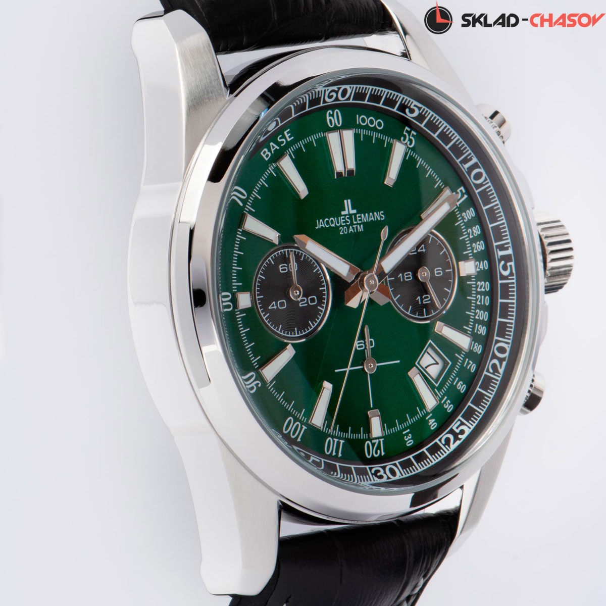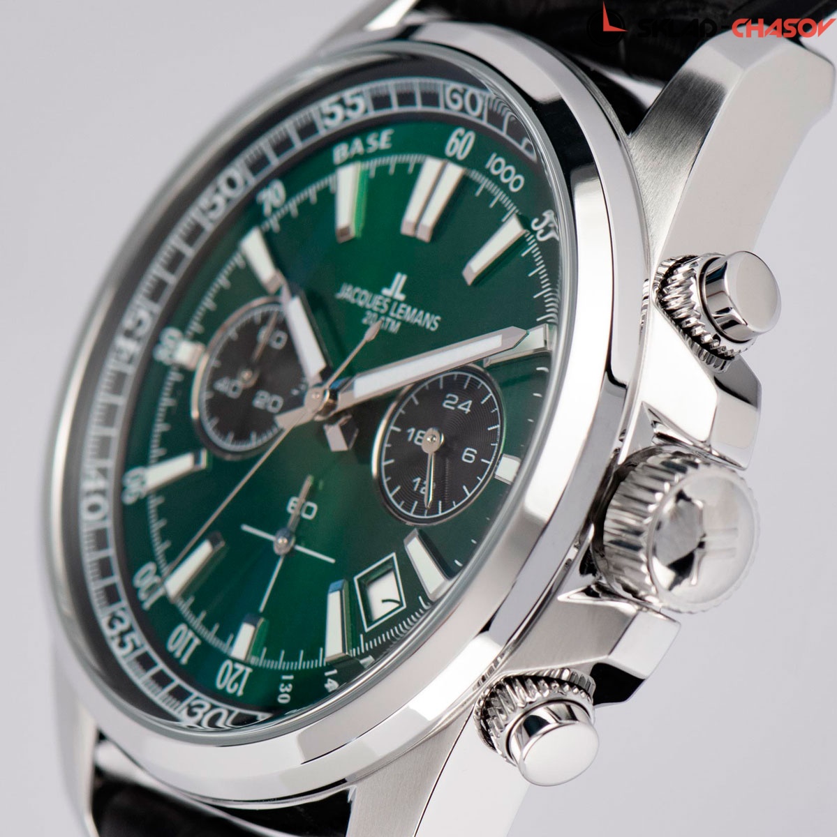 Кнопки хронографа продуманного размера удобно использовать, а для рельефной заводной головки предусмотрена дополнительная защита. На глубоком зеленом циферблате с полировкой в виде солнечных лучей расположены крупные часовая и минутная стрелки и риски с люминесцентным покрытием, которое помогает определить время даже в темноте. Хорошо читаются дополнительные индикаторы 24-х часов, счетчики минут и секунд, окошко даты.