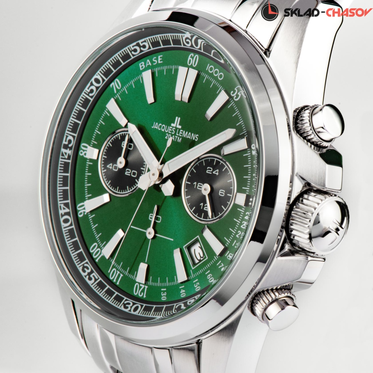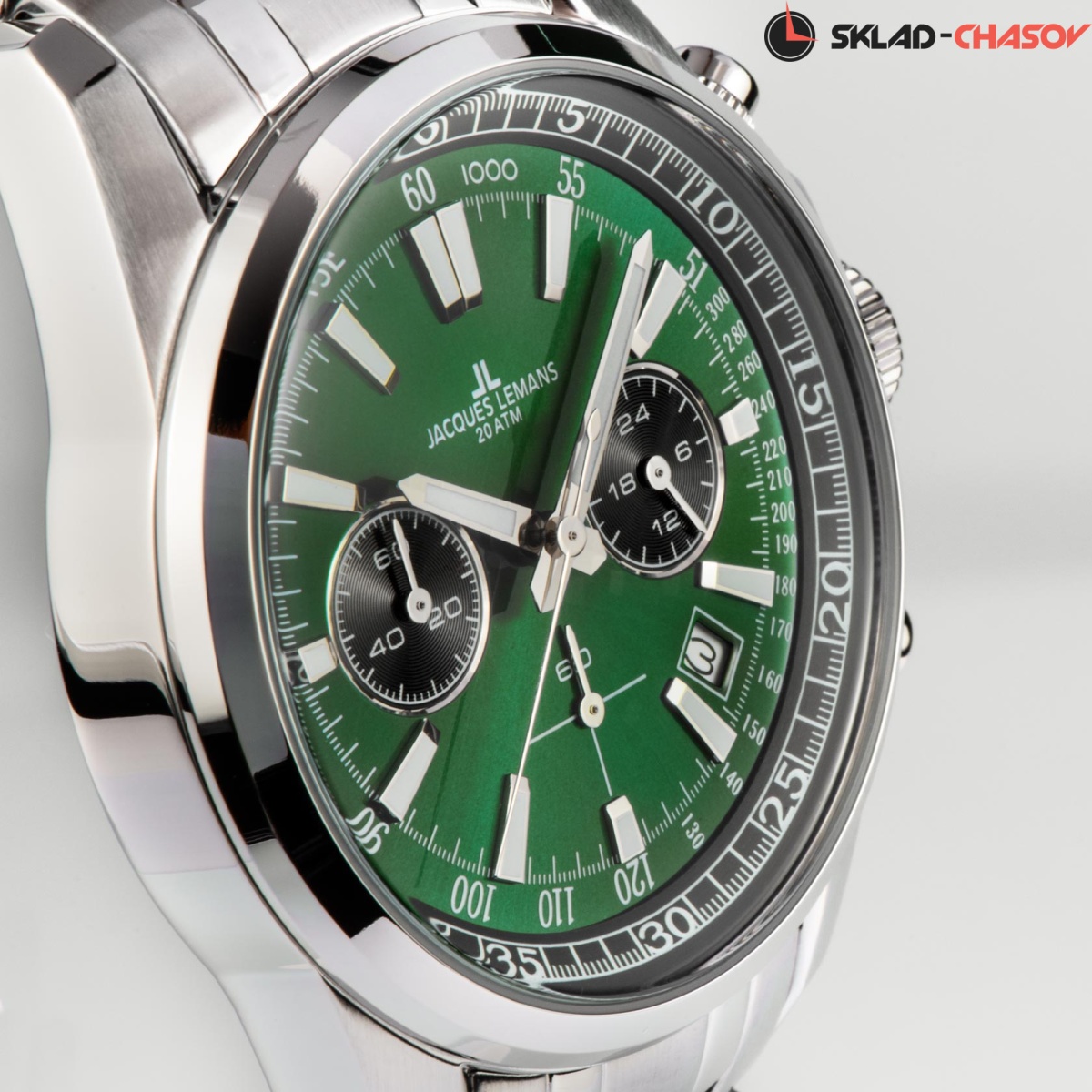 Новинка в знаменитой серии 1117 от Jacques Lemans: стильный кварцевый хронограф с повышенной водостойкостью 20 атмосфер, которую обеспечивают завинчивающаяся заводная головка и крышка. Массивный корпус диаметром 44 мм сделан из нержавеющей стали.