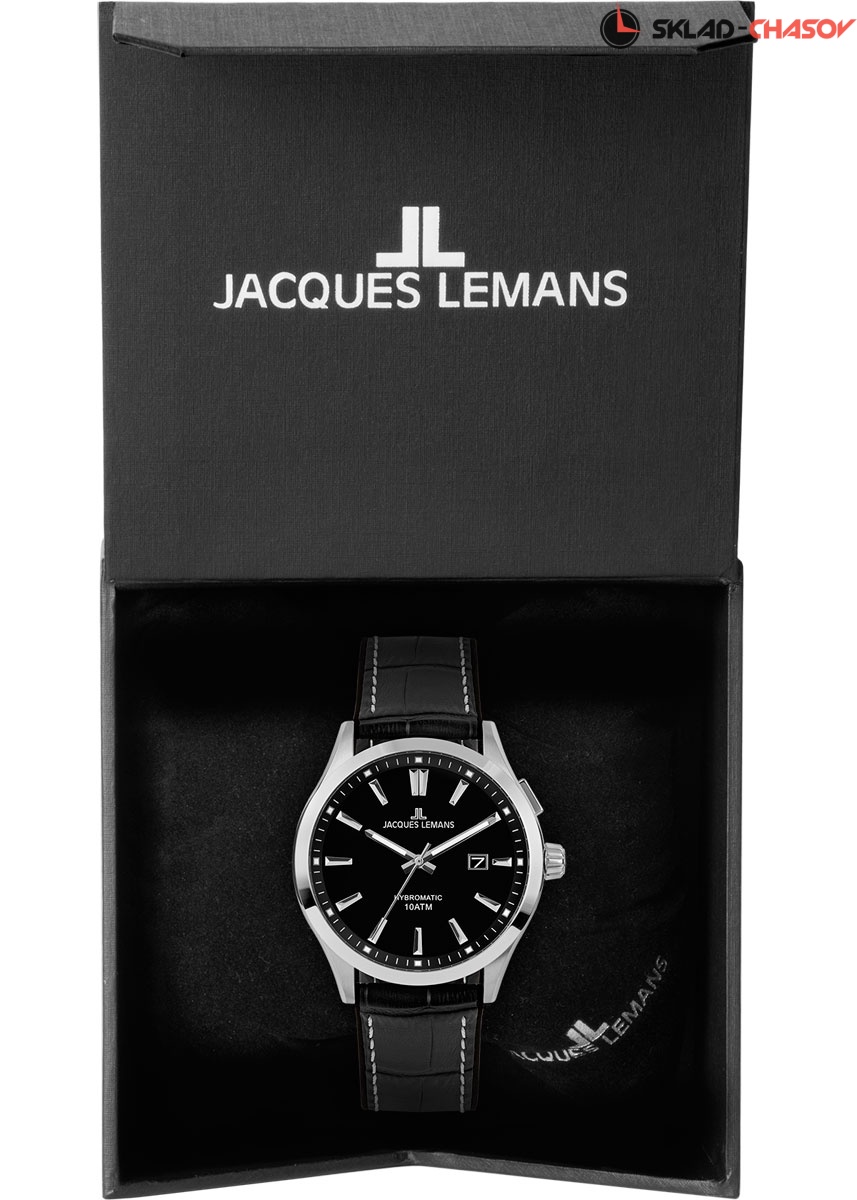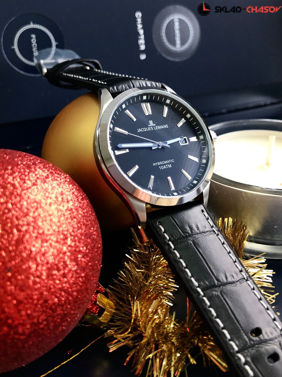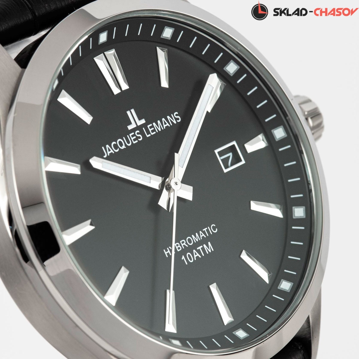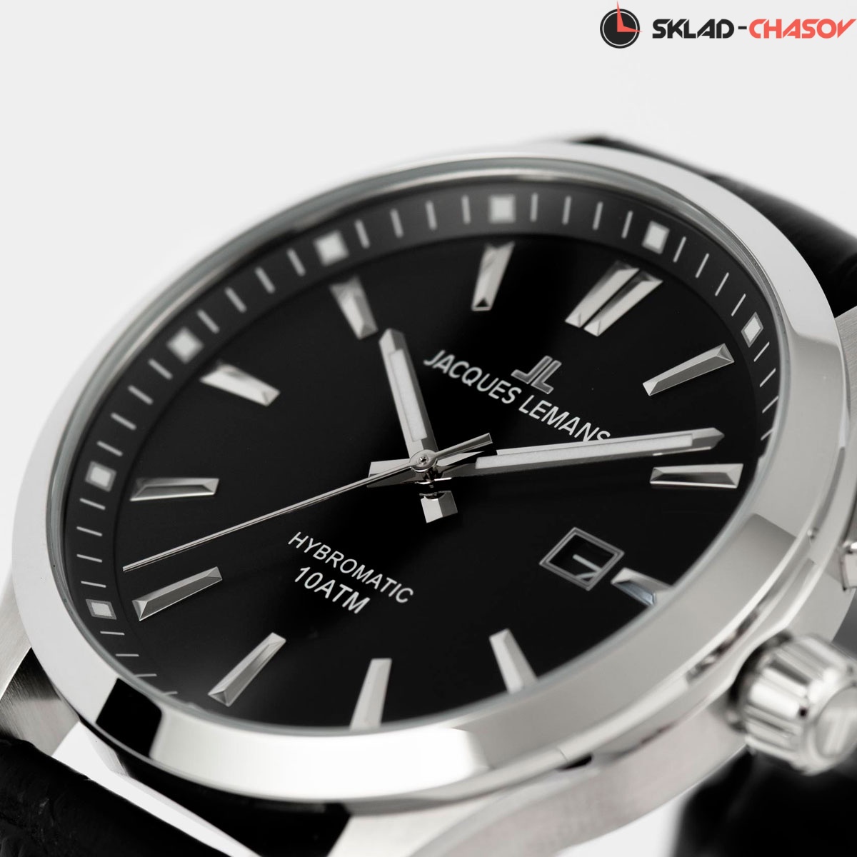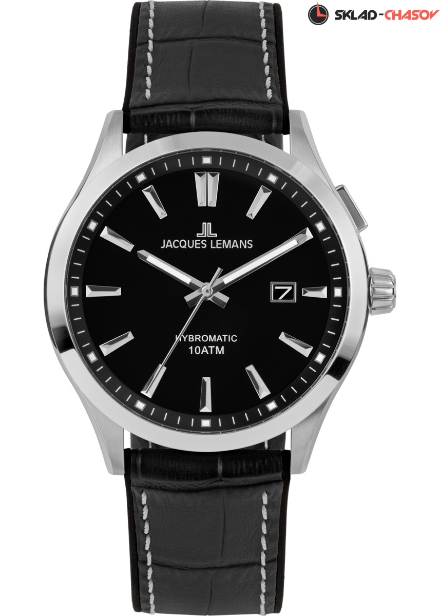 Революционные механические часы: запас хода держится до 180 дней (при полном заводе). Инновационная технология этой модели сочетает в себе функциональность автоматических часов с точностью кварцевых. Особенность Jacques Lemans Hybromatic состоит в том, что энергия для работы часов производится самостоятельно при отсутствии зависимости от элемента питания. Естественные движения руки проводят в движение маховик, генерирующий электрическую энергию, которая используется для запуска часов. Гибридный механизм установлен в корпус диаметром 43 мм из нержавеющей стали. На черном циферблате хорошо читаются крупные стрелки и риски. Они выделены люминесцентным покрытием, которое светится в темноте, помогая определить время в любых условиях видимости. Окошко даты расположено в позиции «3 часа». В модели установлено ударопрочное минеральное стекло Crystex. Прозрачная задняя крышка позволит в подробностях разглядеть необычный механизм. Повышенная водостойкость 10 атмосфер. Ремешок сделан из натуральной кожи черного цвета. Новые часы от Jacques Lemans – идеальный аксессуар на каждый день: универсальный дизайн и возможность завода механизма при естественных движениях руки владельца.