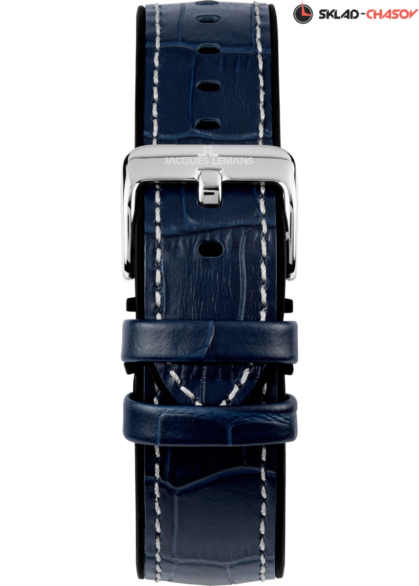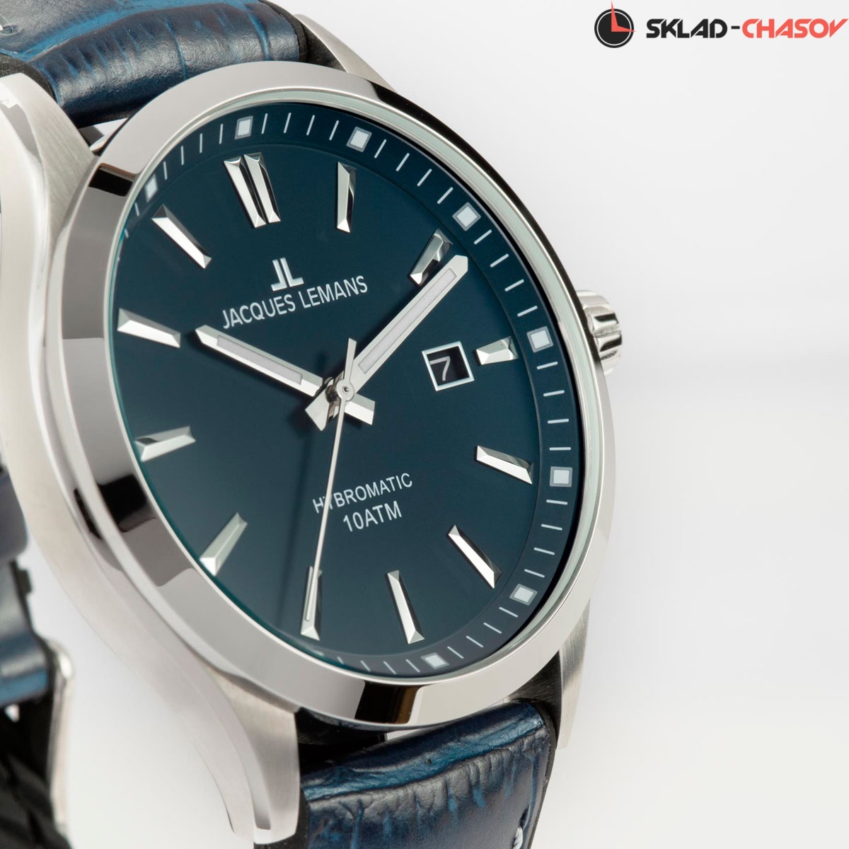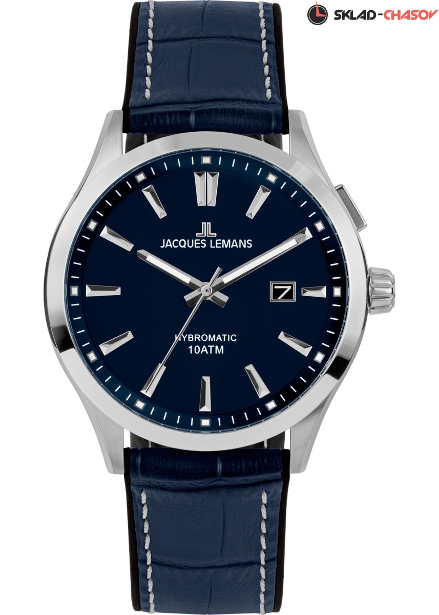 Точный, как кварцевый, функциональный, как автоматический: удивительный гибрид двух механизмов в новых часах от Jacques Lemans. Механизм заряжается при движении руки, обеспечивая запас хода до 180 дней. Корпус диаметром 43 мм дополняет прозрачная задняя крышка и ударопрочное минеральное стекло Crystex. На синем циферблате хорошо читаются крупные стрелки и риски. В позиции «3 часа» - окошко даты. Повышенная водостойкость 10 атмосфер. Для определения оставшегося запаса хода используется отдельная кнопка над заводной головкой (подробности в инструкции). Ремешок сделан из натуральной кожи синего цвета с прошивкой.