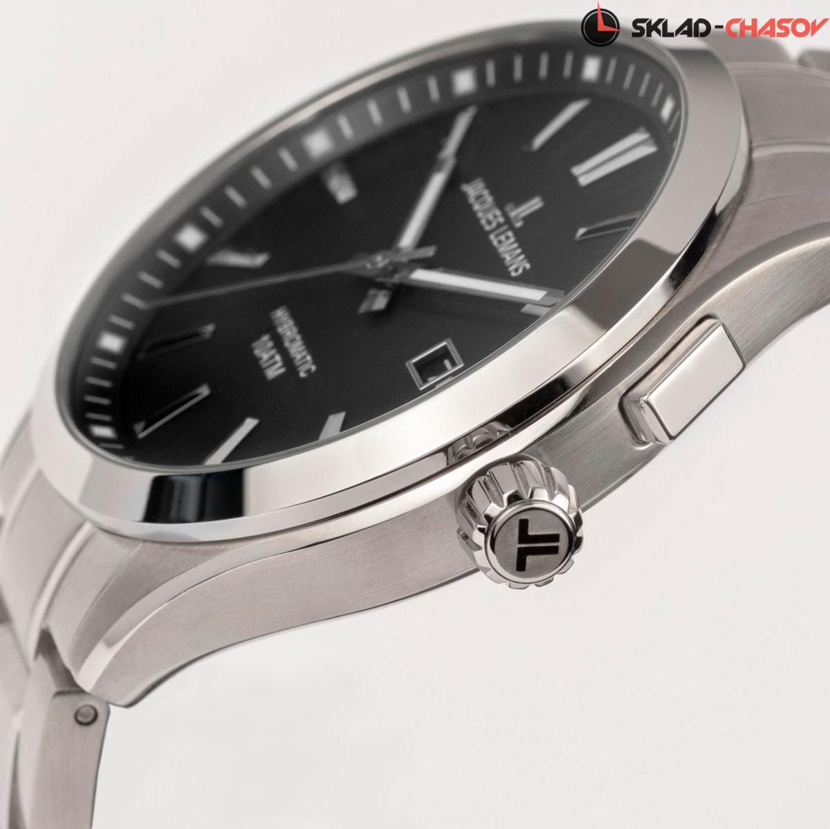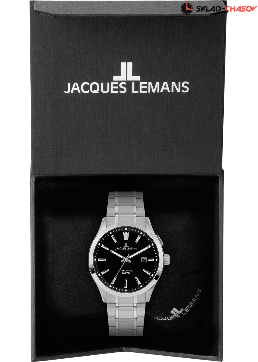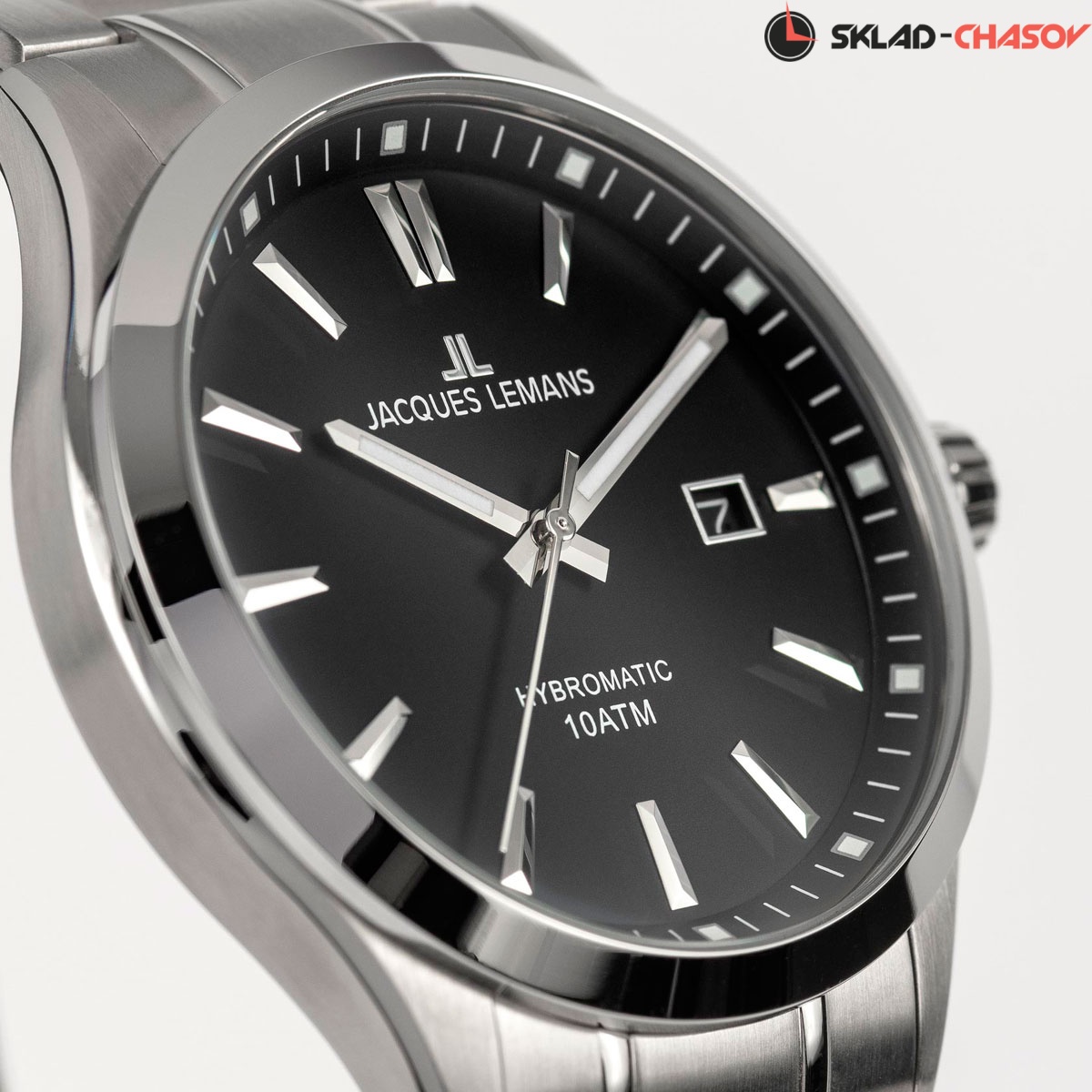 Точный, как кварцевый, функциональный, как автоматический: удивительный гибрид двух механизмов в новых часах от Jacques Lemans. Механизм заряжается при движении руки, обеспечивая запас хода до 180 дней. Корпус диаметром 43 мм дополняет прозрачная задняя крышка и ударопрочное минеральное стекло Crystex. На черном циферблате хорошо читаются крупные стрелки и риски. В позиции «3 часа» - окошко даты. Повышенная водостойкость 10 атмосфер. Для определения оставшегося запаса хода используется отдельная кнопка над заводной головкой (подробности в инструкции). Браслет собран из стальных звеньев, на запястье его надежно удерживает застежка-клипса с логотипом бренда.