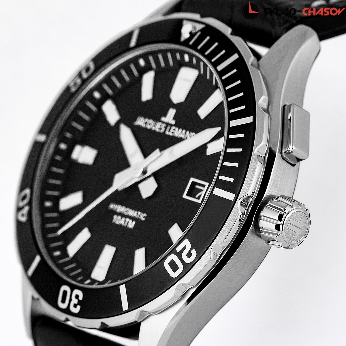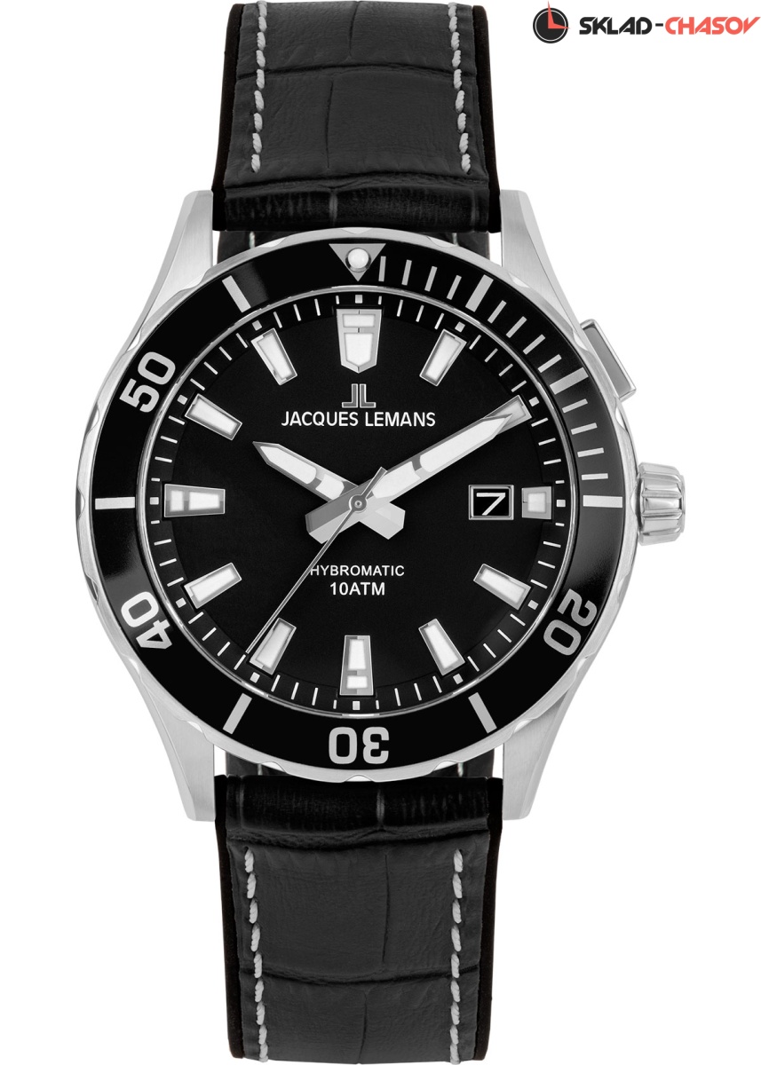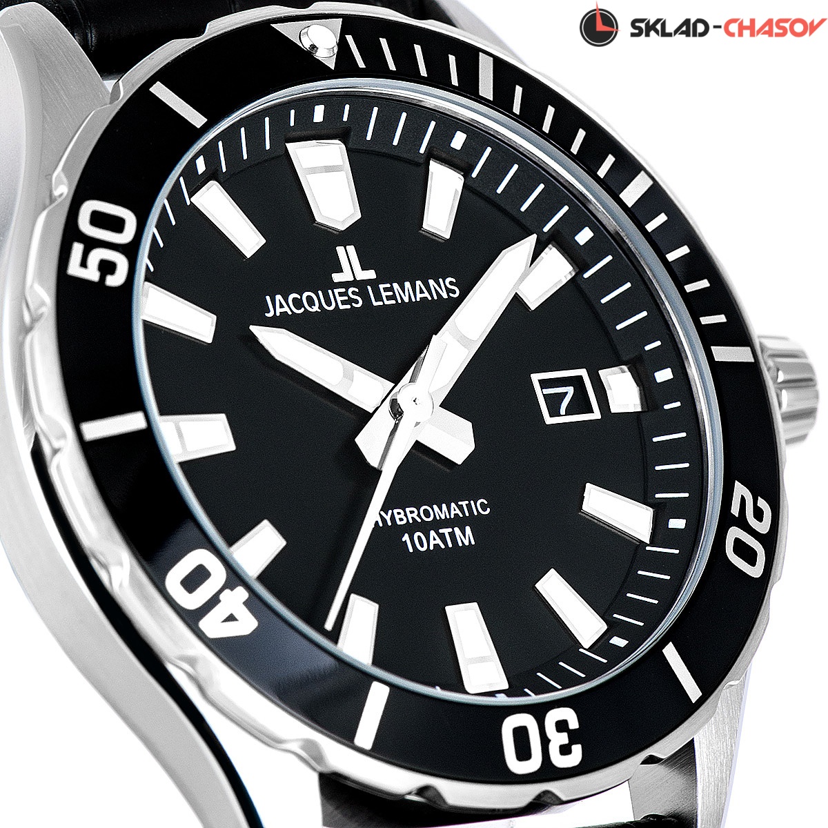 Точный, как кварцевый, функциональный, как автоматический: удивительный гибрид двух механизмов в новых часах от Jacques Lemans. Механизм заряжается при движении руки, обеспечивая запас хода до 180 дней. Корпус диаметром 43 мм дополняет прозрачная задняя крышка и ударопрочное минеральное стекло Crystex. На вращающийся безель нанесена дополнительная индикация. На черном циферблате хорошо читаются крупные стрелки и риски. В позиции «3 часа» - окошко даты. Повышенная водостойкость 10 атмосфер. Для определения оставшегося запаса хода используется отдельная кнопка над заводной головкой (подробности в инструкции). Ремешок сделан из натуральной кожи черного цвета с прошивкой.