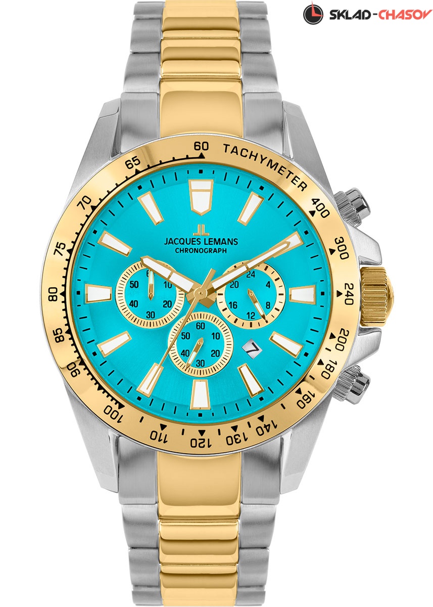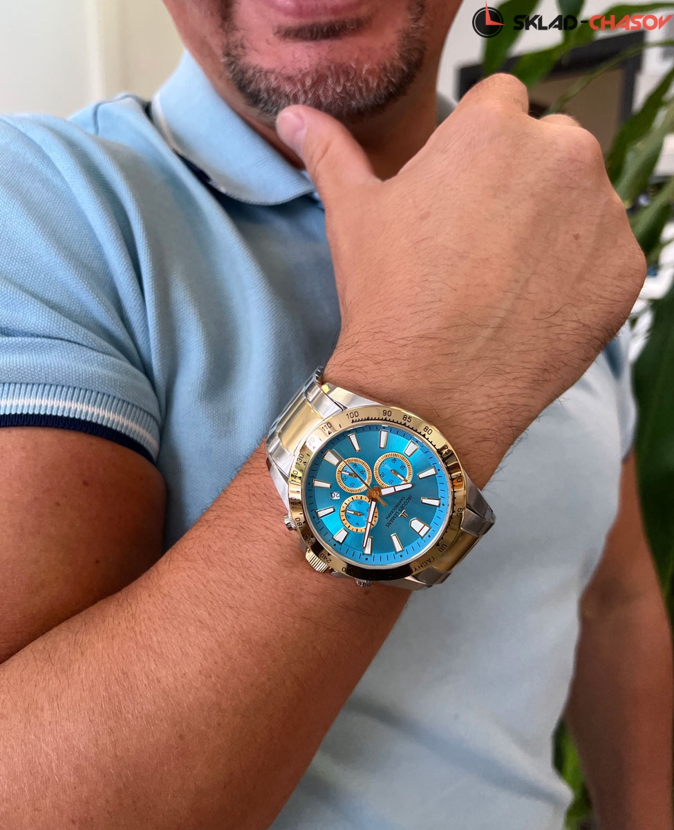 Браслет из нержавеющей стали и удобная застежка-клипса надежно удерживают хронограф на запястье. Звенья браслета и корпус декорированы с помощью PVD-покрытия из желтого золота.