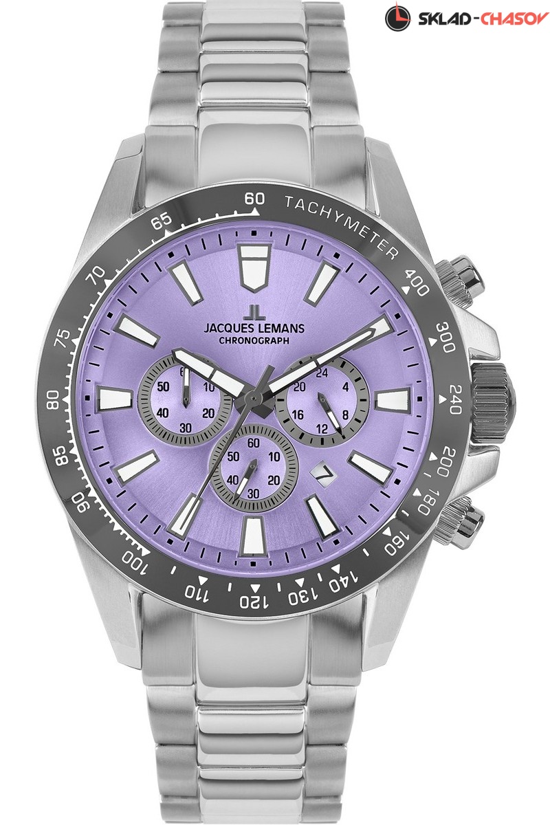 Кварцевый хронограф в мощном корпусе диаметром 48 мм. Нержавеющая сталь, из которой он сделан, отличается гипоаллергенными свойствами и стойкостью к коррозии. Широкий контрастный безель с тахиметрической шкалой обрамляет циферблат бледно-сиреневого оттенка. На нем расположены три дополнительных индикатора и окошко даты. С помощью индикаторов можно засекать временные промежутки (секунды и минуты) и определять время в 24-часовом формате времяисчисления. В модели установлено минеральное стекло. Повышенная водостойкость равна 10 атмосфер. Браслет из нержавеющей стали удерживает на запястье застежка-клипса с двумя боковыми кнопками и дополнительной защитой. Часы Jacques Lemans, надежные и функциональные, хорошо дополнят образ в спортивном или повседневном стиле.