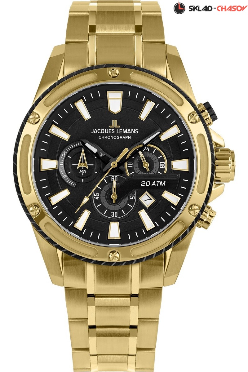 Кварцевый механизм хронографа установлен в крупный 48-миллиметровый корпус из нержавеющей стали c PVD-покрытием из желтого золота.