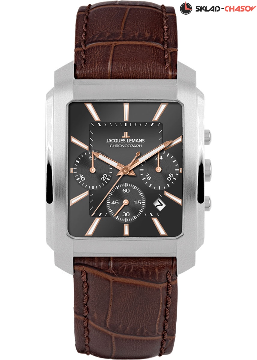 Кварцевые часы отличает необычная форма корпуса из нержавеющей стали — вытянутый прямоугольник с выступающими боковыми частями, на одной из которых размещены лаконичные кнопки хронографа и заводная головка.