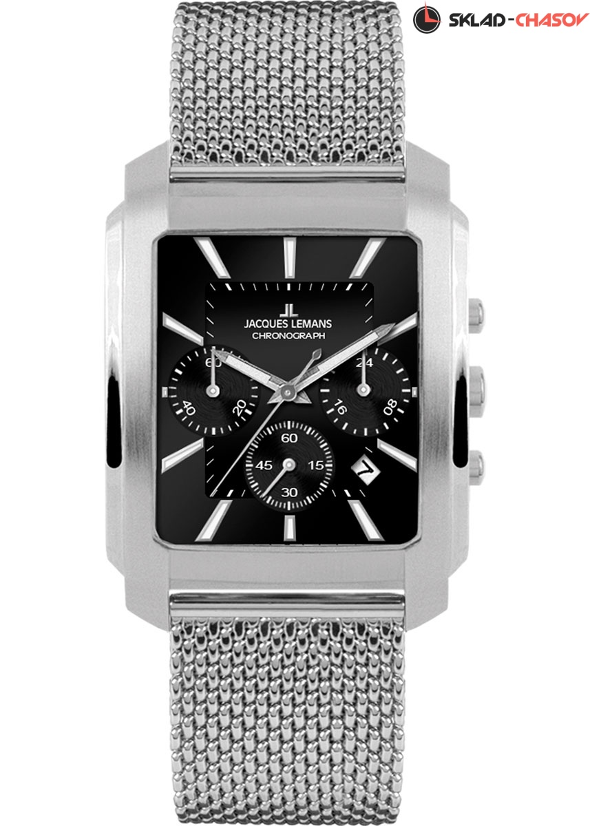 Кварцевые часы отличает необычная форма корпуса из нержавеющей стали — вытянутый прямоугольник с выступающими боковыми частями, на одной из которых размещены лаконичные кнопки хронографа и заводная головка.