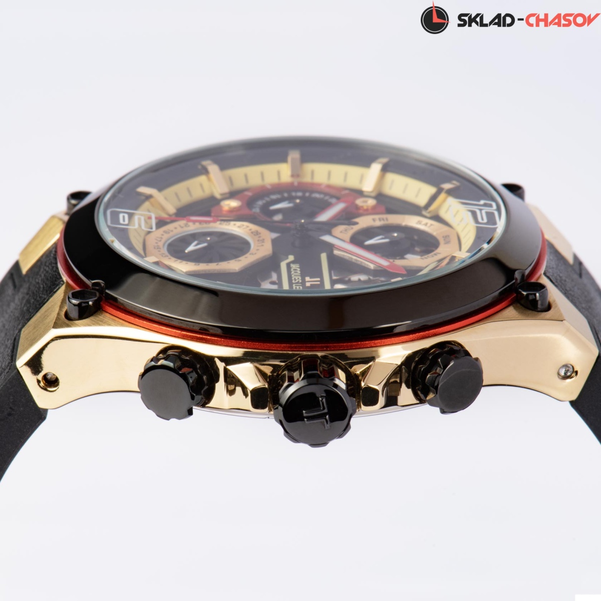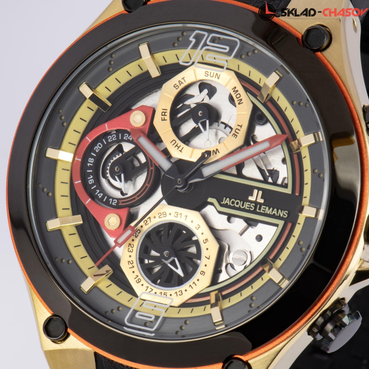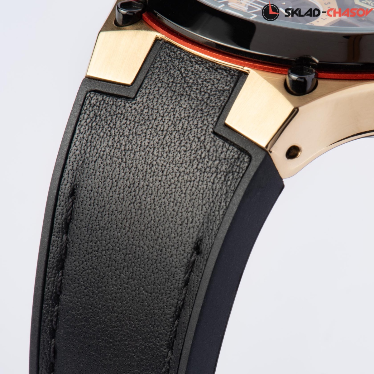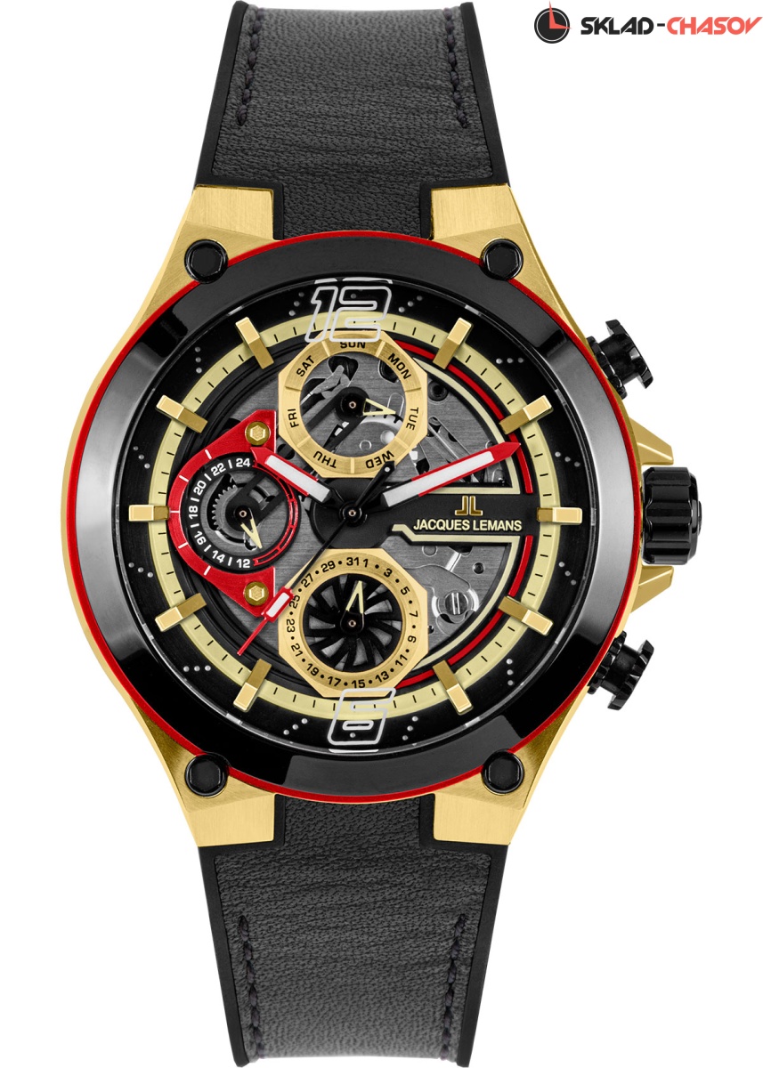 44-миллиметровый корпус с PVD-покрытием черного, красного и золотистого цветов украшают декоративные винты. Циферблат состоит из нескольких уровней. Нижний — прозрачный, что дает возможность разглядеть кварцевый механизм. Каждый из трех дополнительных индикаторов, даты, дня недели и 24-х часов, выделен стальной рамкой с индивидуальным дизайном. Объемные риски с зеркальной полировкой закреплены на отдельной пластине с перфорацией, а цифры 12 и 6 нанесены на минеральное стекло модели.