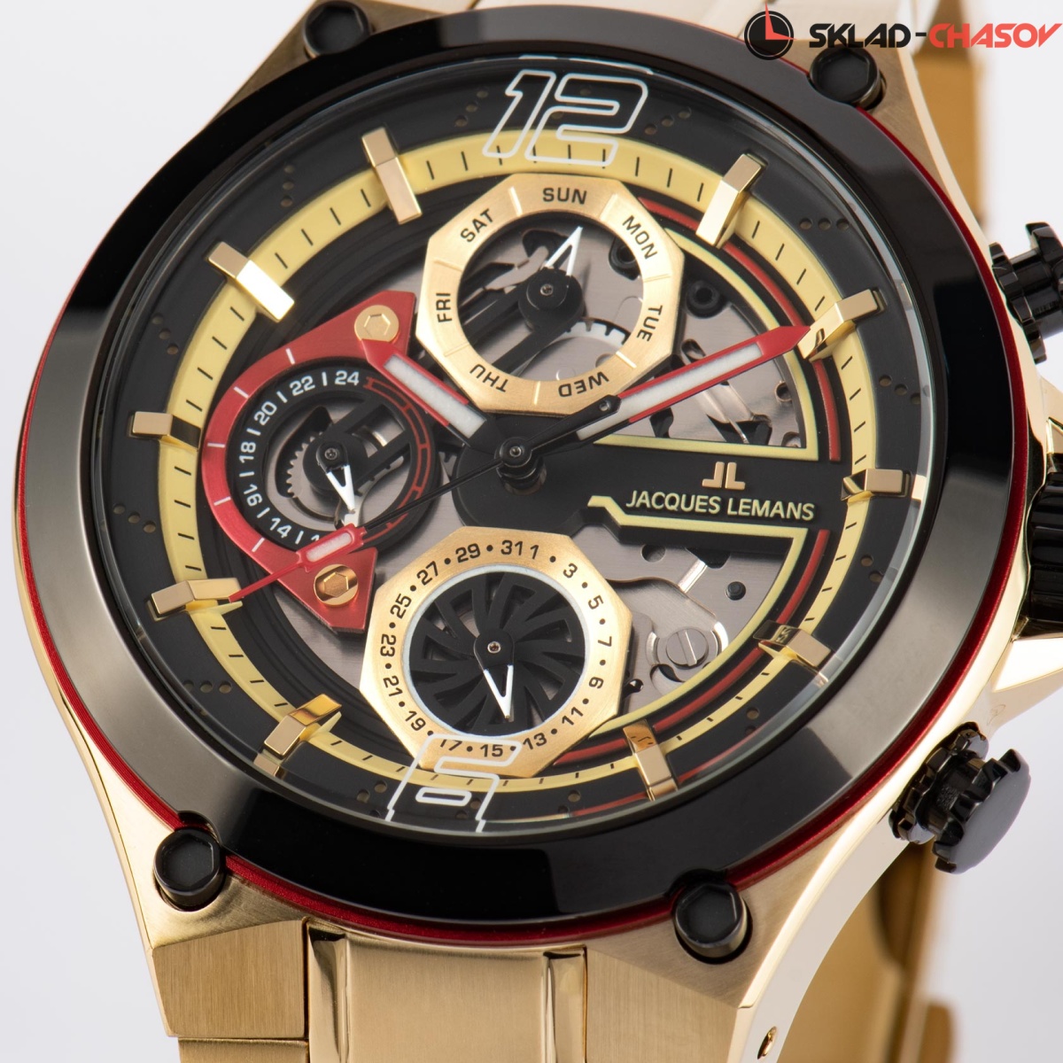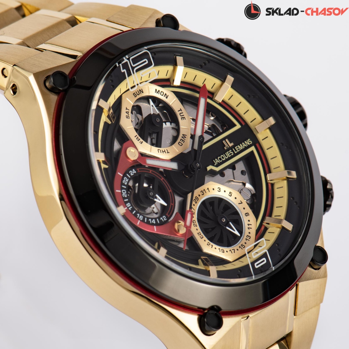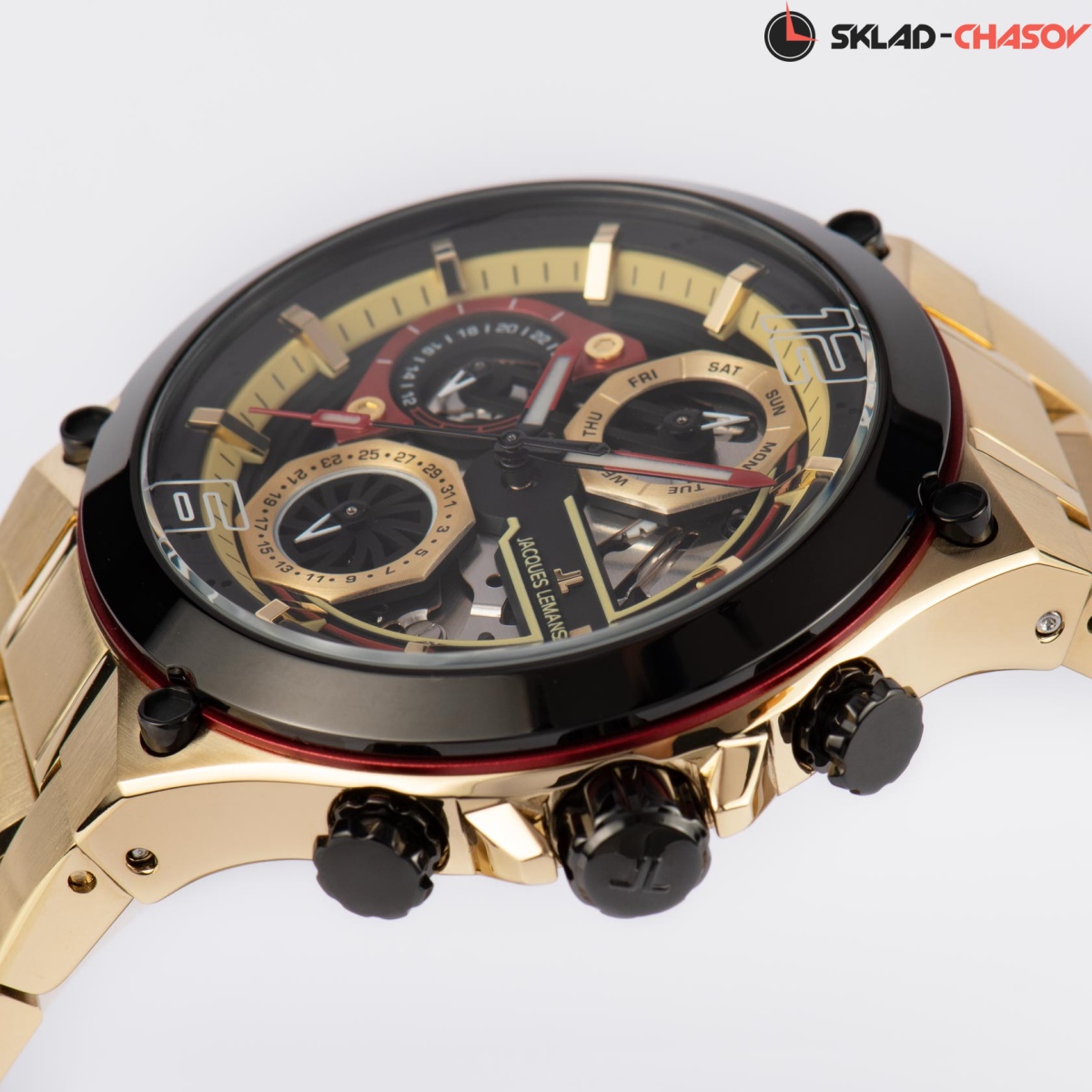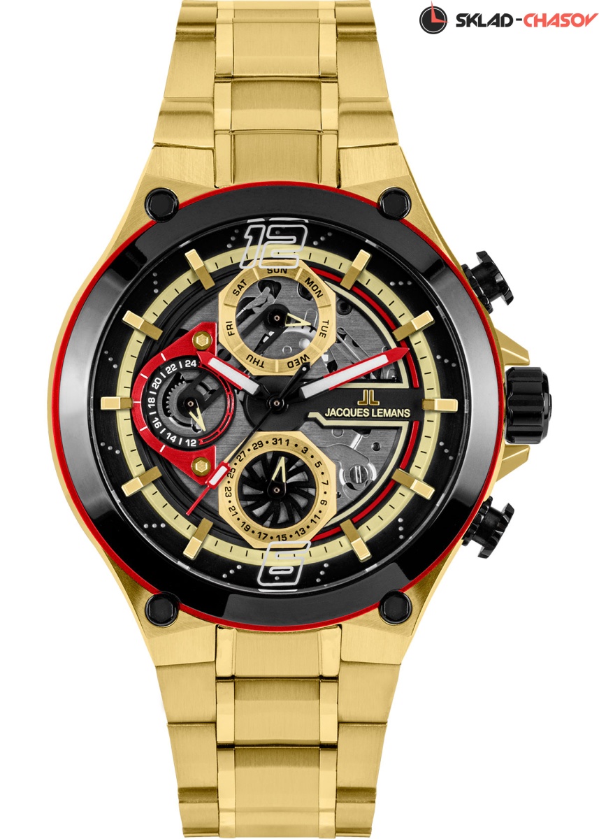 Повышенная водостойкость составляет 10 атмосфер. Заводная головка завинчивается. Это предотвращает ее случайное выпадение в воде. 44-миллиметровый корпус из нержавеющей стали с яркой комбинацией цветов PVD-покрытия — черного, красного и золотистого - украшен четырьмя декоративными винтами. Браслет собран из стальных звеньев, завершает его удобная в использовании застежка-клипса. Она будет надежно удерживать часы на запястье. Часы серии Manchester – эффектный аксессуар, который станет ярким элементом вашего образа, как спортивного, так и повседневного.