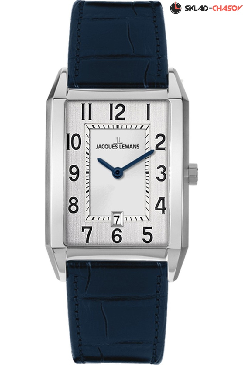 Серия 1-2160 включает классические часы, которые вы будете с удовольствием надевать каждый день. Удобный корпус (34х52 мм) в форме стильного прямоугольника сделан из гипоаллергенной нержавеющей стали, материала, который способен сопротивляться появлению микроцарапин. Минеральное стекло с сапфировым напылением защищает белый двухуровневый циферблат. Точно определить время помогут хорошо читаемые арабские цифры и стрелки, выделенные контрастным цветом. На 6 часах расположено окошко даты с накладной рамкой. Ремешок сделан из натуральной кожи темно-синего цвета, застежка-пряжка украшена логотипом бренда Jacques Lemans.