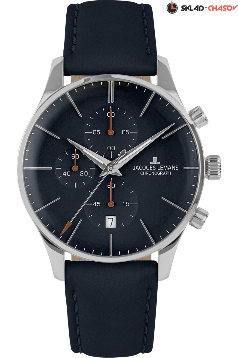 Кварцевый механизм хронографа серии 1-2163 установлен в классический круглый корпус диаметром 40 мм, сделанный из нержавеющей стали. Особенность модели — выпуклое минеральное стекло, еще одна отсылка к стилю ретро. На синем циферблате все 6 стрелок выполняют свои функции: центральные показывают время с точностью до секунды, с помощью трех дополнительных индикаторов можно засекать время в минутах, секундах и 1/10 секунды. Окошко даты разместили на 6 часах. Ремешок сделан из натуральной кожи темно-синего цвета с прошивкой, застежка-пряжка украшена логотипом бренда Jacques Lemans.