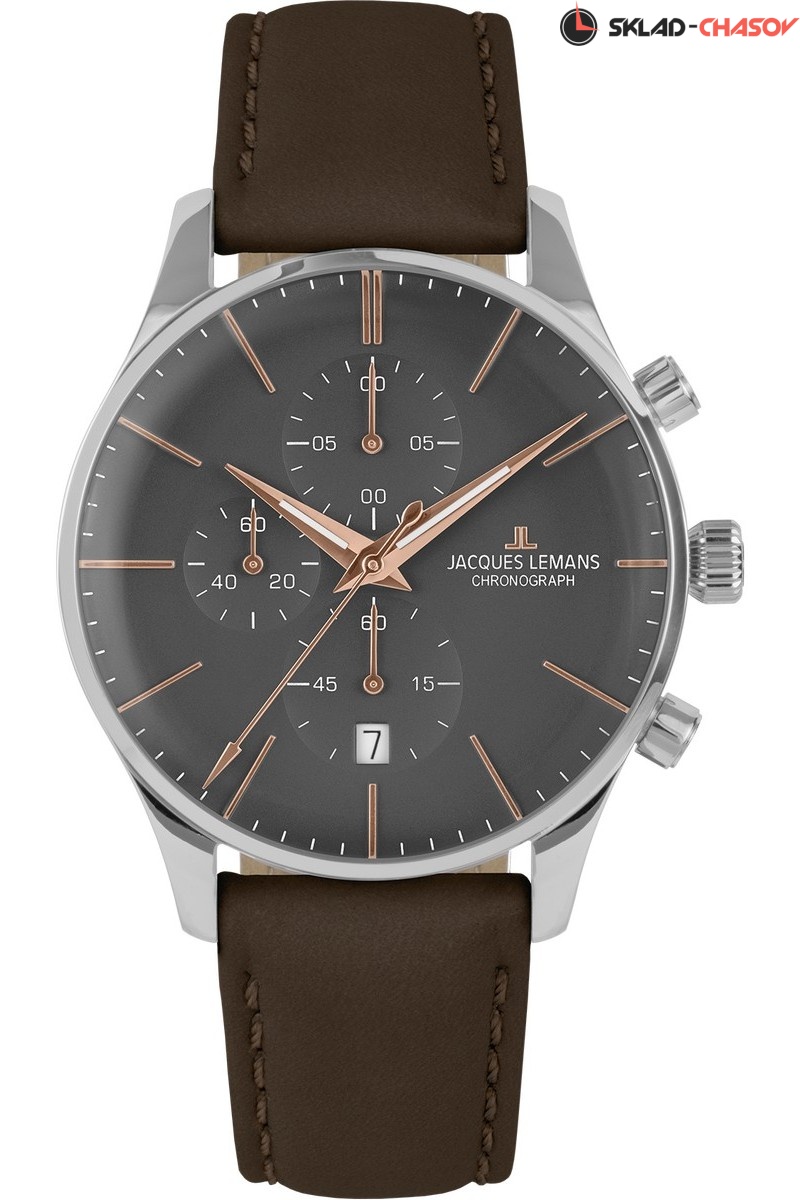 Кварцевый механизм хронографа серии 1-2163 установлен в классический круглый корпус диаметром 40 мм, сделанный из нержавеющей стали. Особенность модели — выпуклое минеральное стекло, еще одна отсылка к стилю ретро. На темно-сером циферблате все 6 стрелок выполняют свои функции: центральные показывают время с точностью до секунды, с помощью трех дополнительных индикаторов можно засекать время в минутах, секундах и 1/10 секунды. Окошко даты разместили на 6 часах. Ремешок сделан из натуральной кожи темно-коричневого цвета с прошивкой, застежка-пряжка украшена логотипом бренда Jacques Lemans.