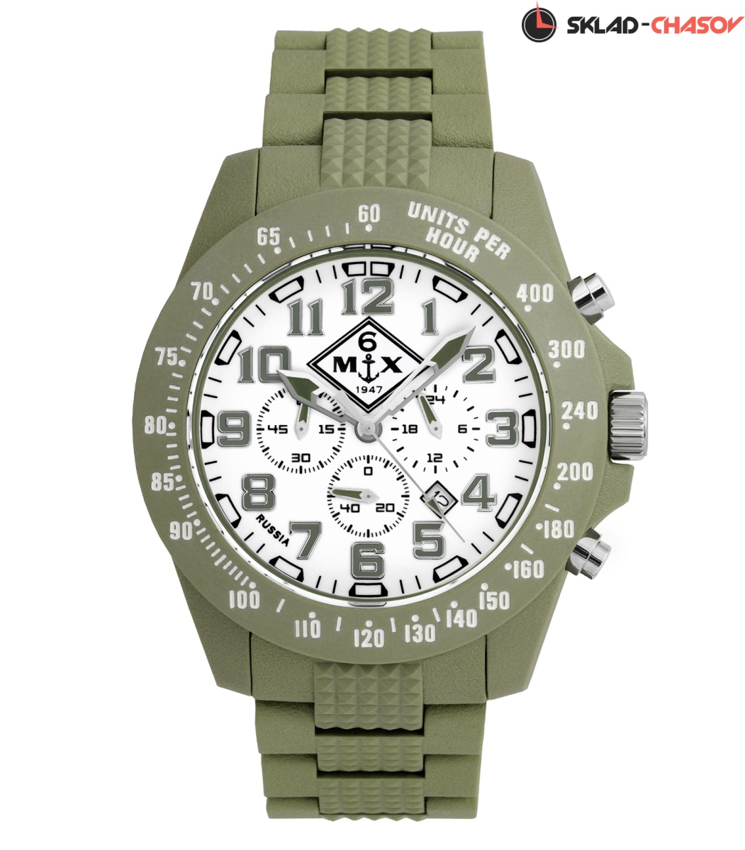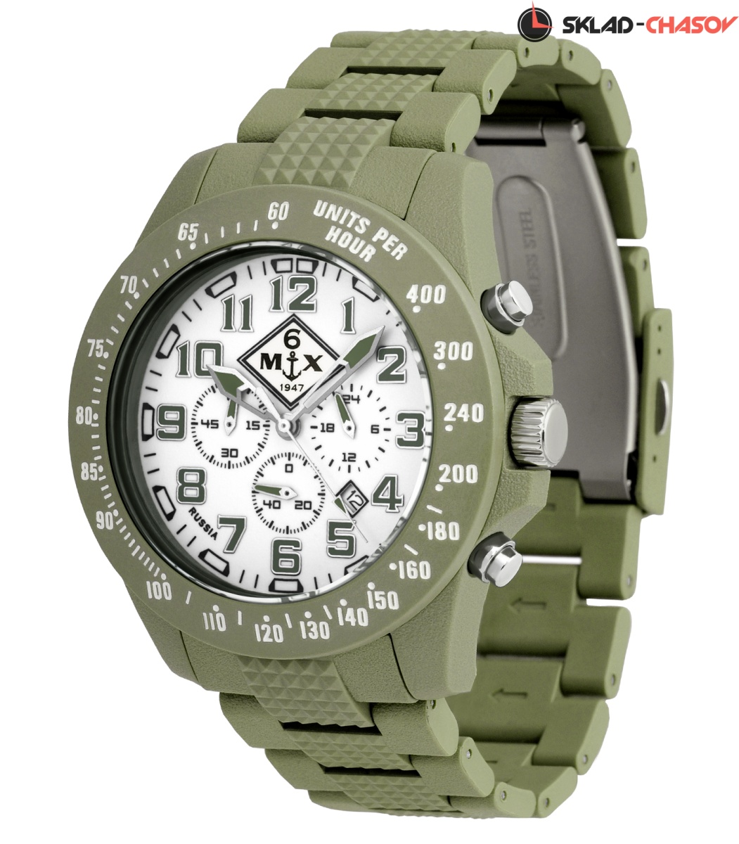 Крупный корпус из фибергласса диаметром 48 мм с тахиметрической* шкалой на безеле удерживает браслет из фибергласса с фиксирующейся пряжкой. Прочное минеральное стекло и переводная головка с винтовым фиксатором удерживают давление воды в WR200 (20 атм)осфер.