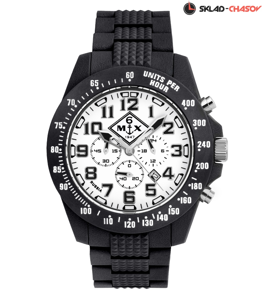Крупный корпус из фибергласса диаметром 48 мм с тахиметрической* шкалой на безеле удерживает браслет из фибергласса с фиксирующейся пряжкой. Прочное минеральное стекло и переводная головка с винтовым фиксатором удерживают давление воды в WR200 (20 атм)осфер.