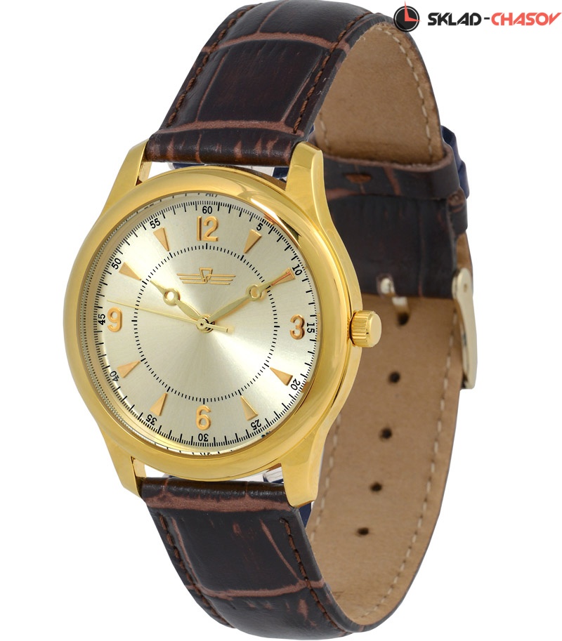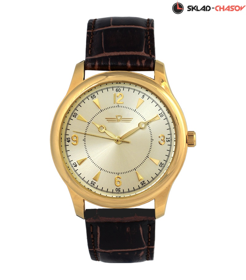 Циферблат золотистого цвета с позолоченными накладными индексами.
