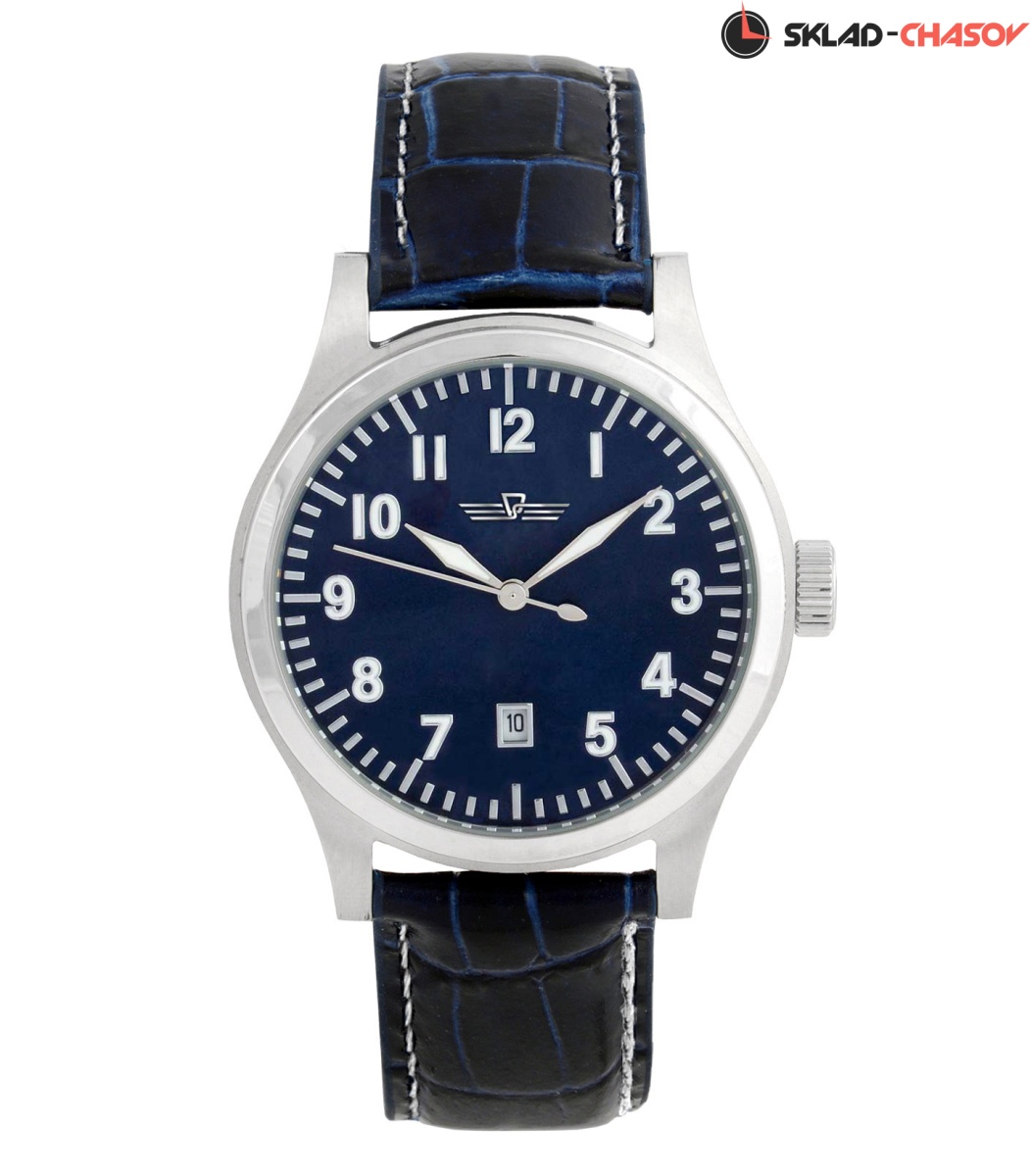 Умеренный милитари-стиль сглажен мягкими очертаниями корпуса. Крупные часовые и минутные индексы, арабские цифры широким шрифтом, тёмно-синий циферблат и синий кожаный ремень, матированный стальной корпус - всё это рецепт отличной стильной модели часов.