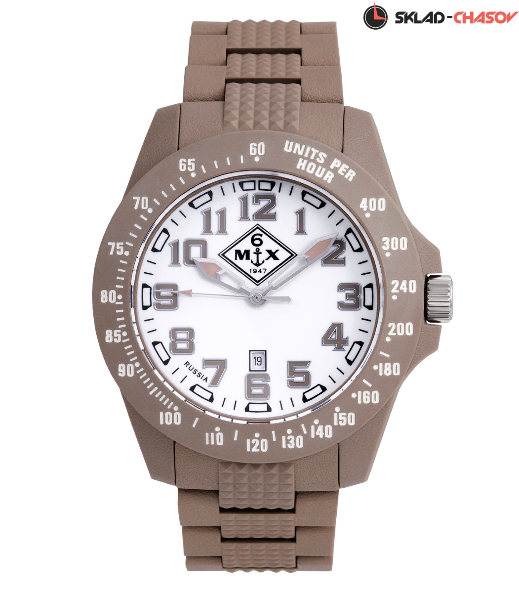 Крупный корпус из фибергласса диаметром 48 мм с тахиметрической* шкалой на безеле удерживает браслет из фибергласса с фиксирующейся пряжкой. Прочное минеральное стекло и переводная головка с винтовым фиксатором удерживают давление воды в WR200 (20 атм)осфер.