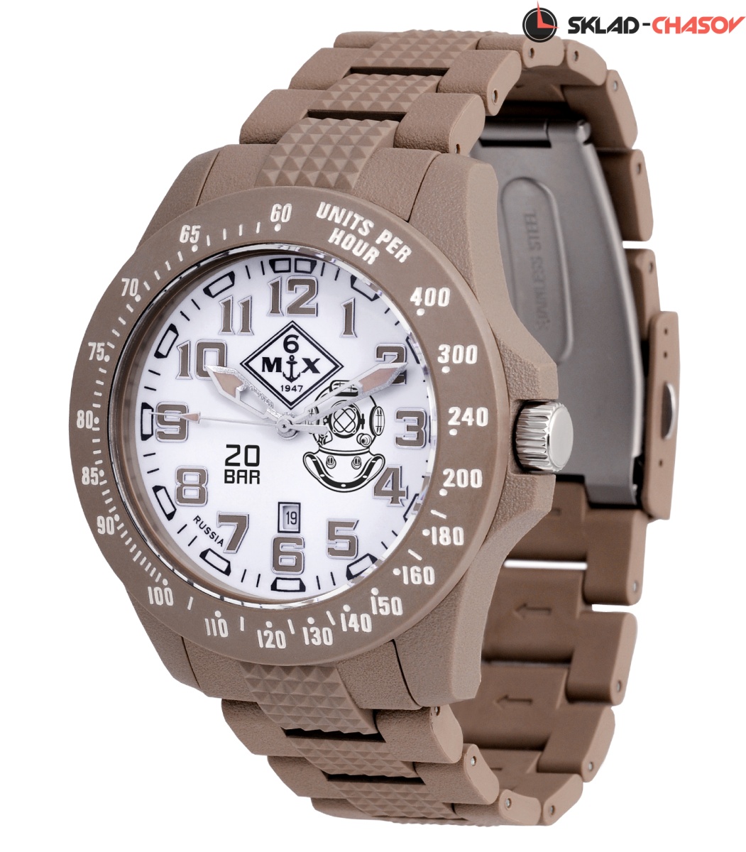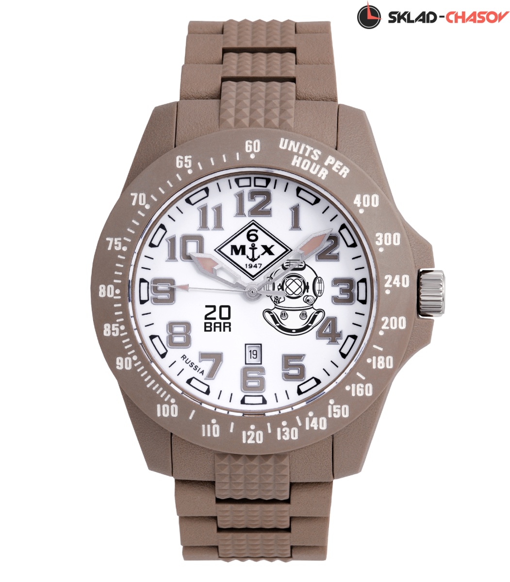 Крупный корпус из фибергласса диаметром 48 мм с тахиметрической* шкалой на безеле удерживает браслет из фибергласса с фиксирующейся пряжкой. Прочное минеральное стекло и переводная головка с винтовым фиксатором удерживают давление воды в WR200 (20 атм)осфер.