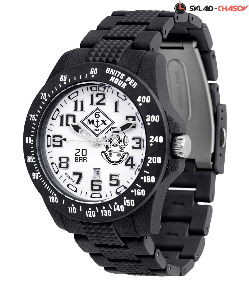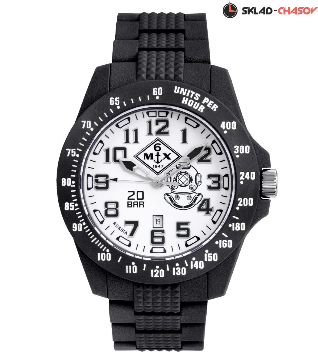 Крупный корпус из фибергласса диаметром 48 мм с тахиметрической* шкалой на безеле удерживает браслет из фибергласса с фиксирующейся пряжкой. Прочное минеральное стекло и переводная головка с винтовым фиксатором удерживают давление воды в WR200 (20 атм)осфер.