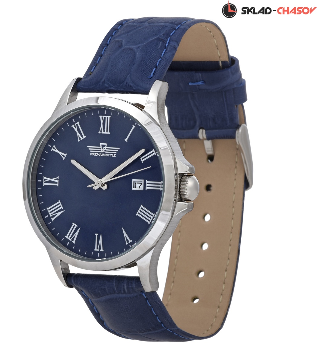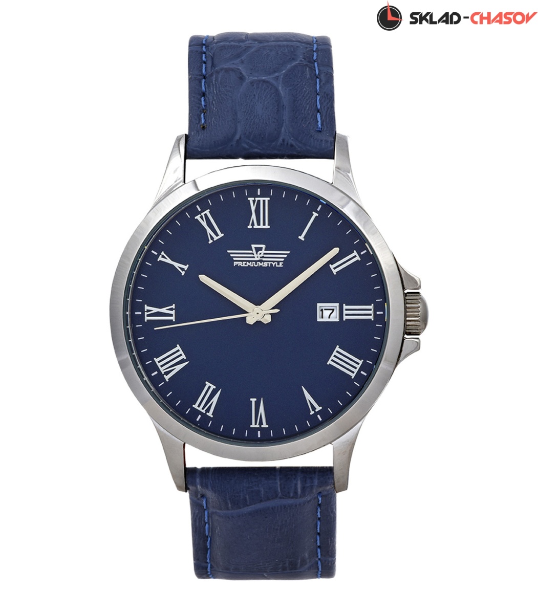 Синий глянцевый циферблат, на котором отчётливо видны часовые индексы.