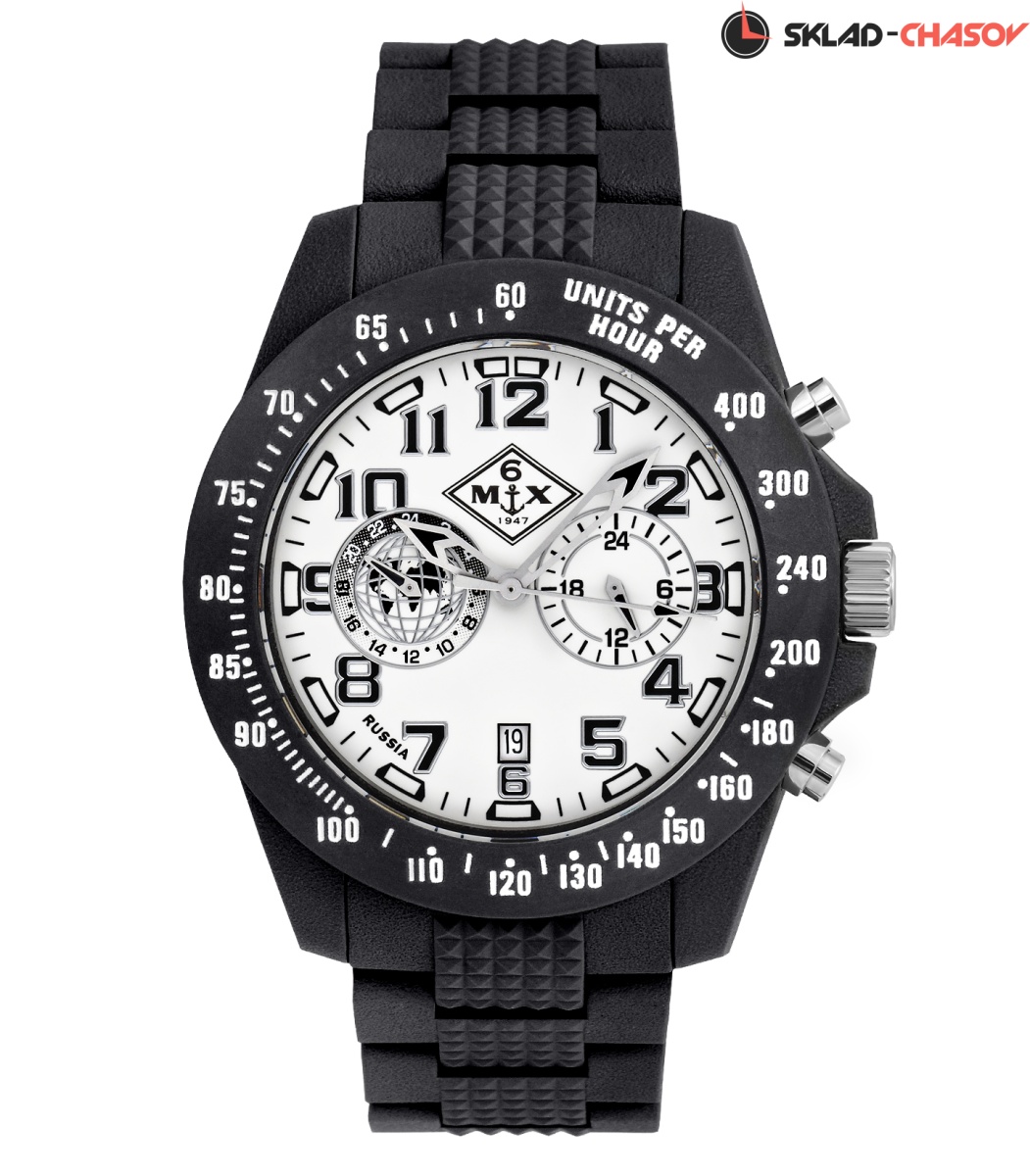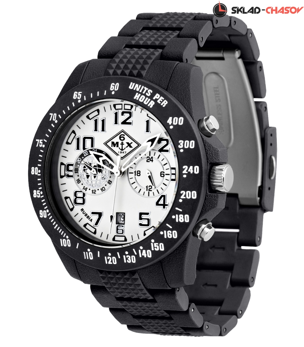 Наручные часы в корпусе и с браслетом из фибергласса чёрного цвета. В часах установлен японский кварцевый механизм.