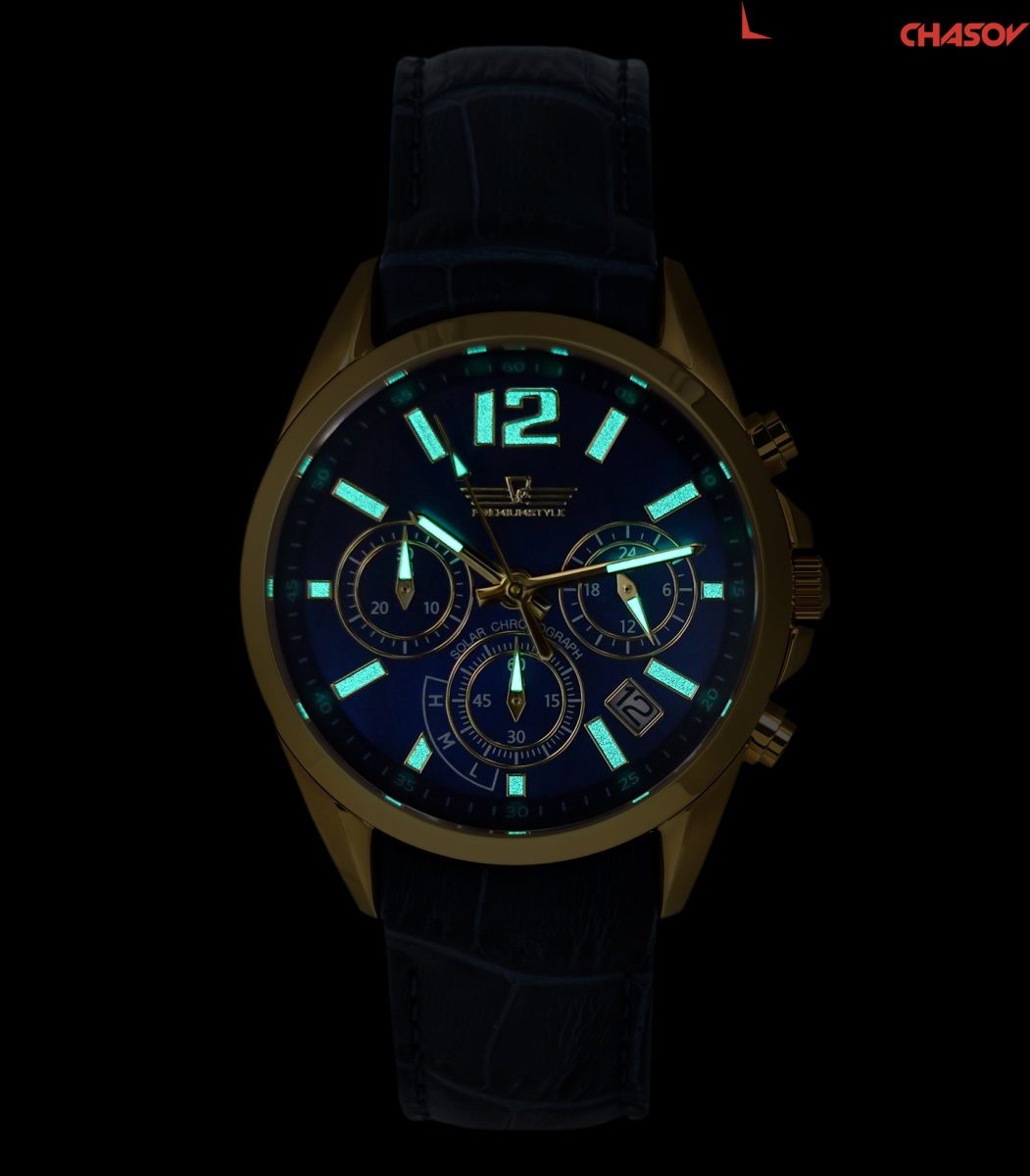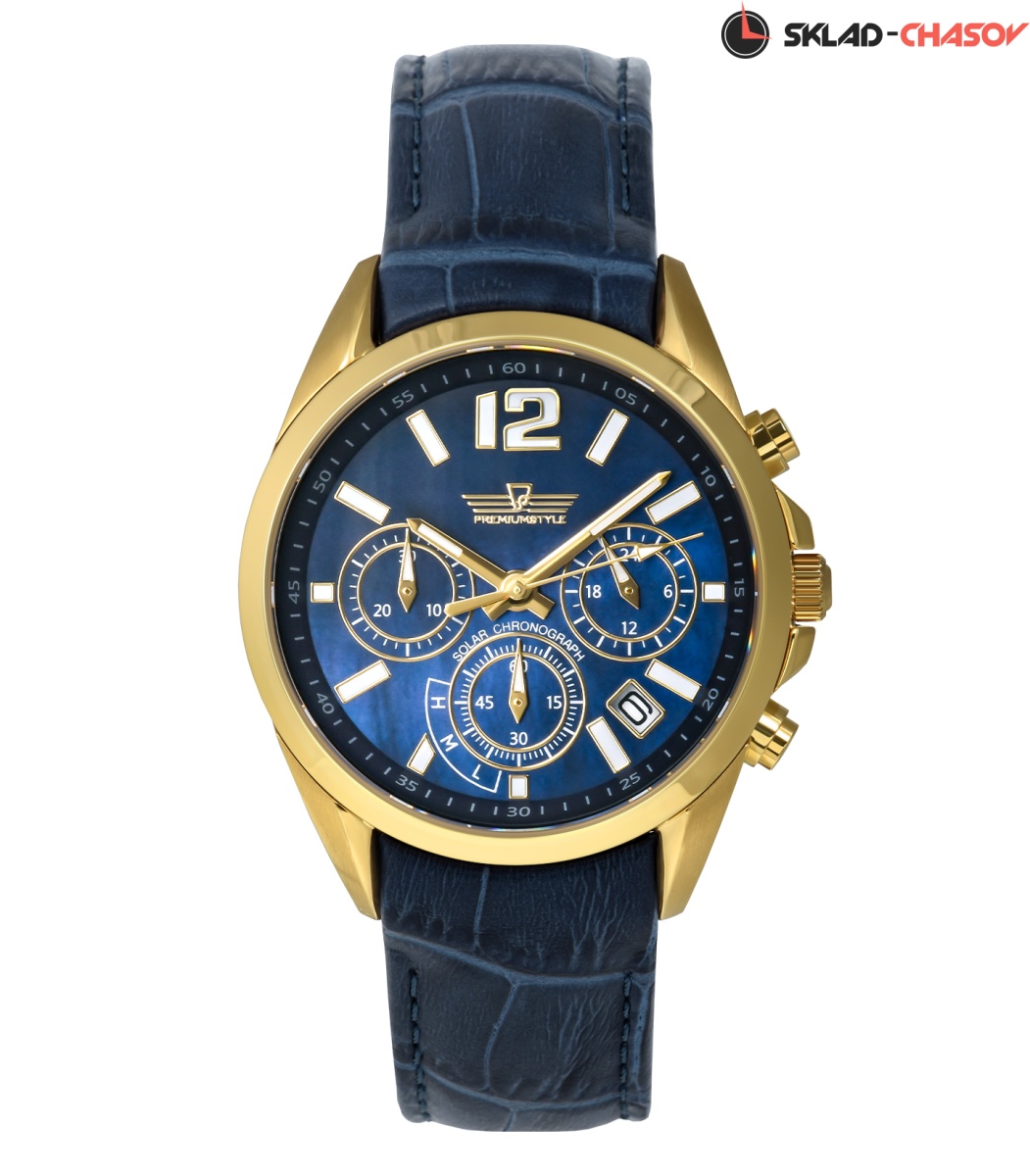 Функции – 24-часовая шкала, сплит-хронограф и индикатор уровня заряда батареи.