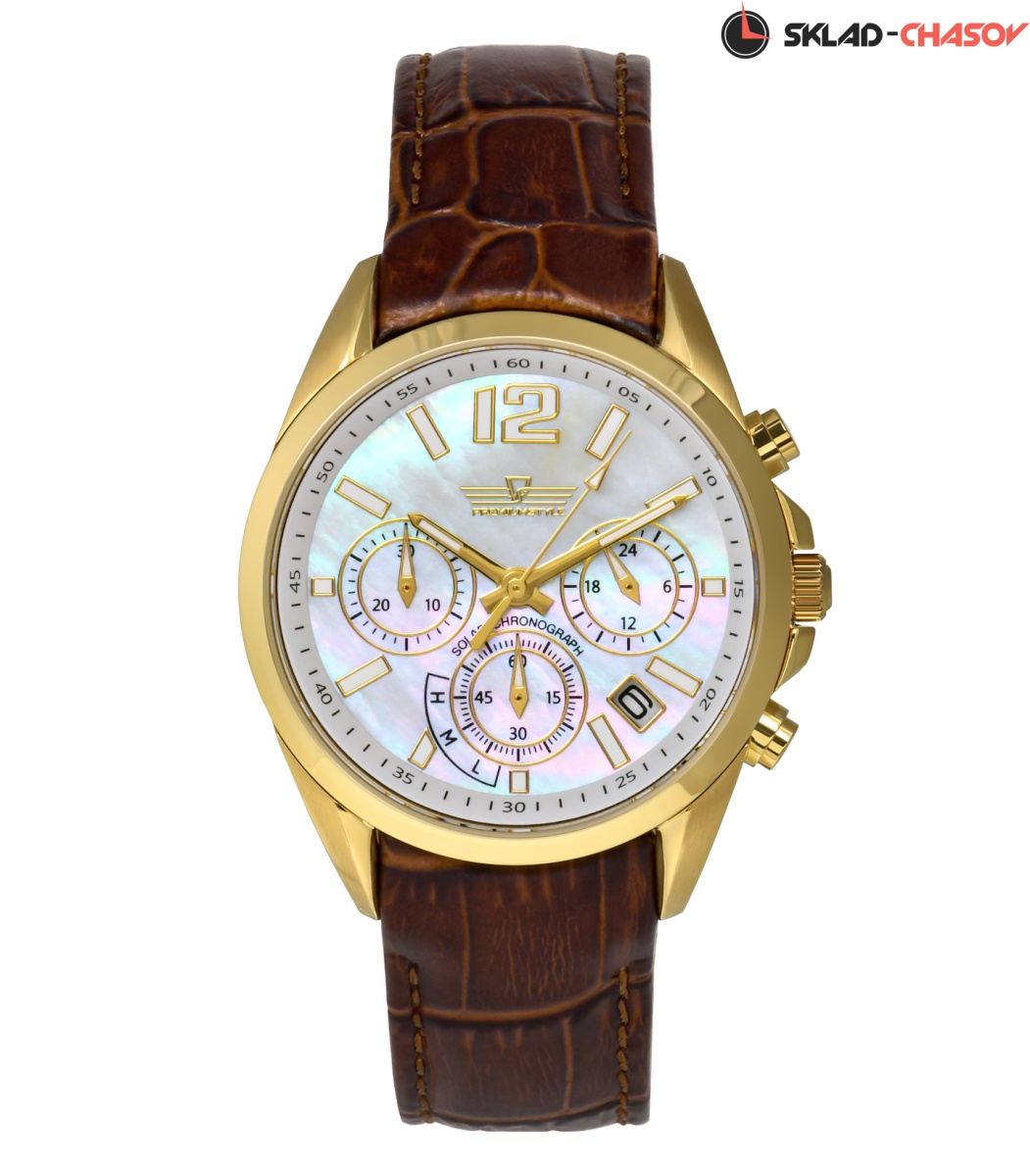 Функции – 24-часовая шкала, сплит-хронограф и индикатор уровня заряда батареи.