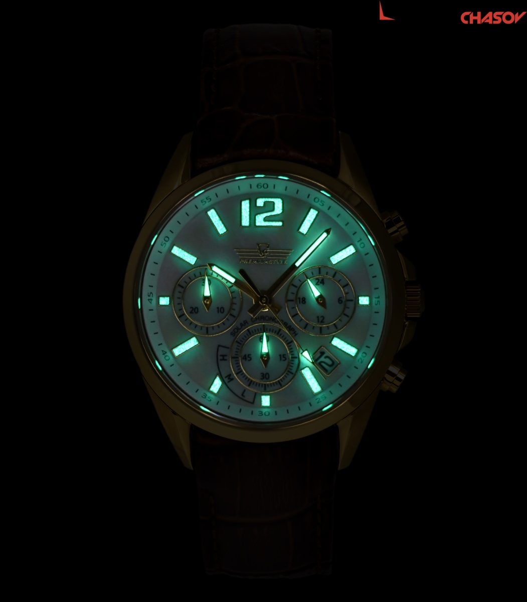 Циферблат выполнен из натурального тонированного перламутра и оснащен стрелками и метками со светонакопителем.