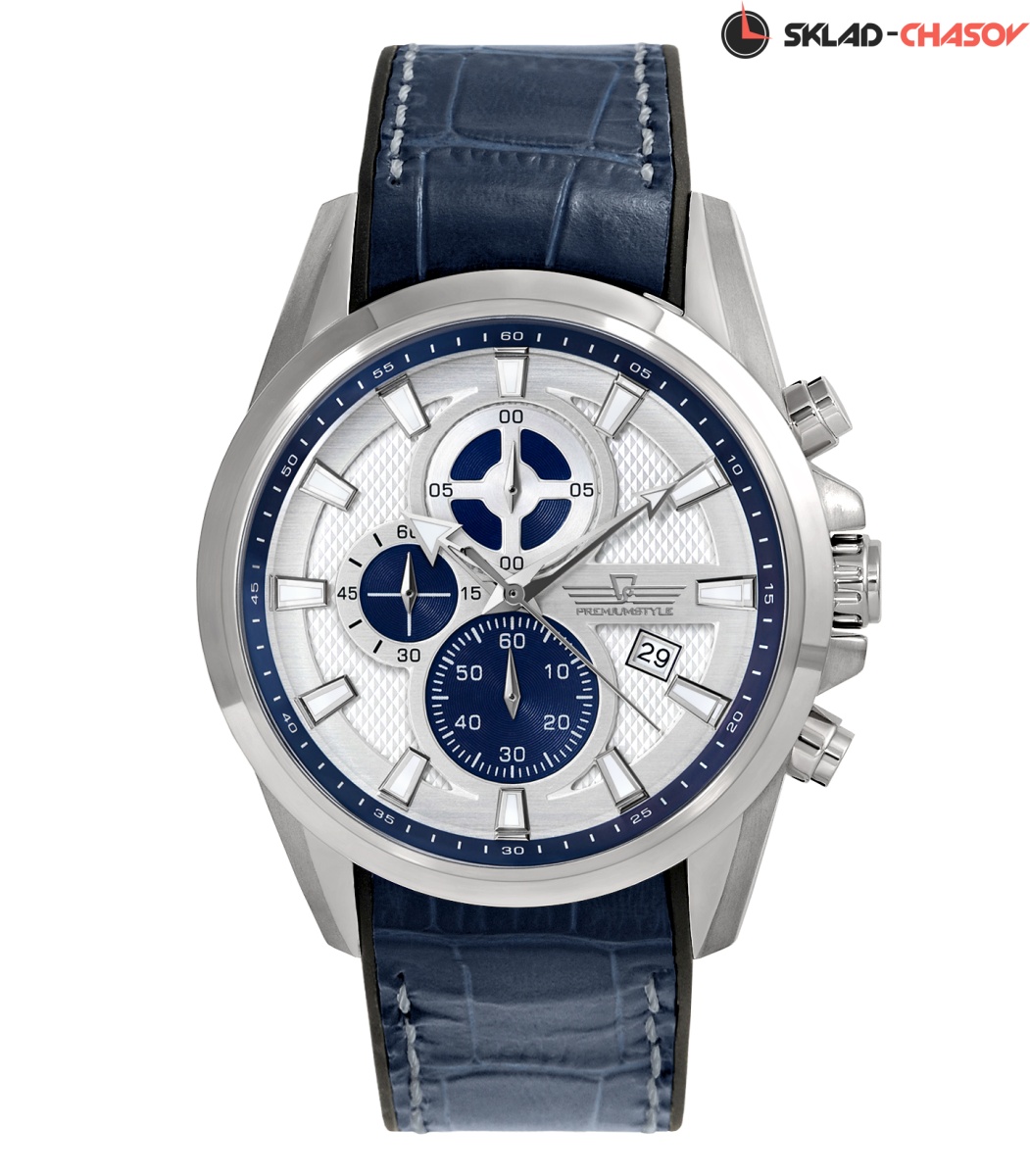 Центральная секундная стрелка часов не относится к механизму хронометража, как у многих хронографов - многим это нравится, так как не создаётся впечатление, что часы стоят, как в случае, когда центральная секундная стрелка запускается кнопками хронографа. У отметки "6" часов - секундный накопитель хронографа, у отметки "12" часов - 1/10 секунд, а левый накопитель у отметки "9" часов считывает минуты хронографа. "Окошко" даты расположено у отметки "5" часов.