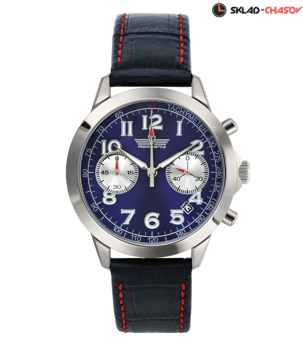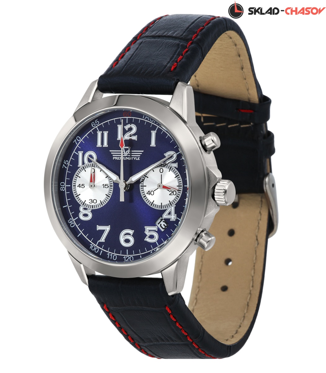 Часы оснащены тремя центральными стрелками: часовой, минутной, центральная стрелка секундного накопителя хронографа. Секундная стрелка малая на 3х ч., 60-минутный накопитель хронографа на 9ч. Календарное окно между 4 и 5 часов.