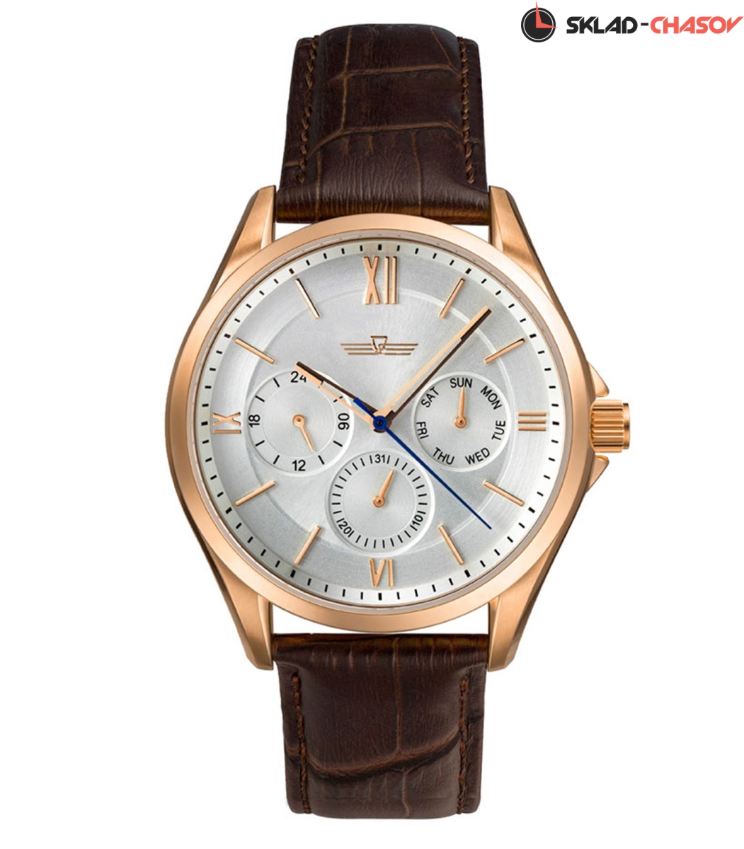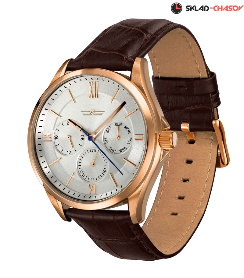 Часы оснащены механизмом SEIKO с центральными секундной, минутной и часовой стрелками и стрелочной индикацией дня недели, числа месяца и 24-шкалой. Точность хода +-20сек/мес.