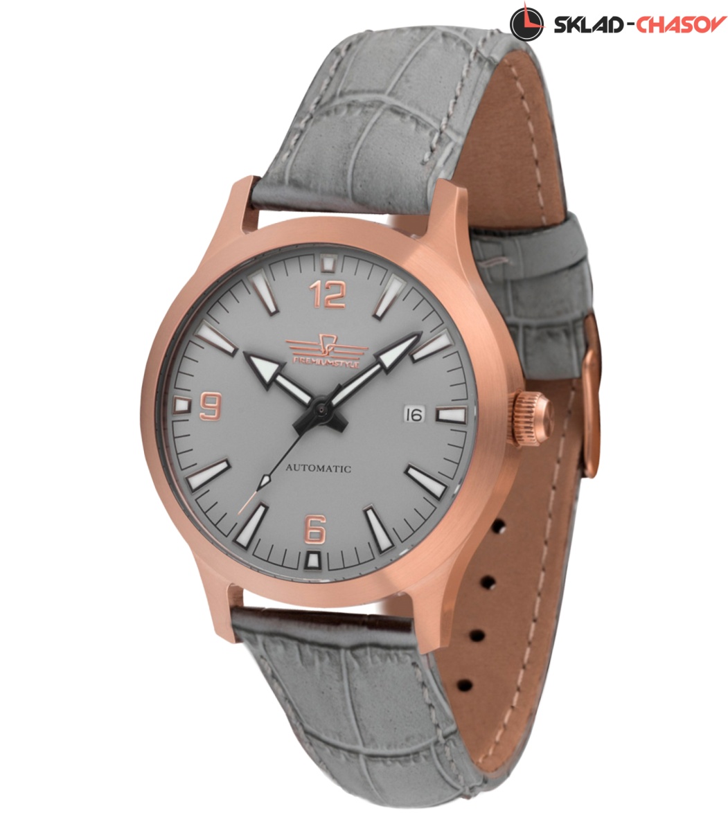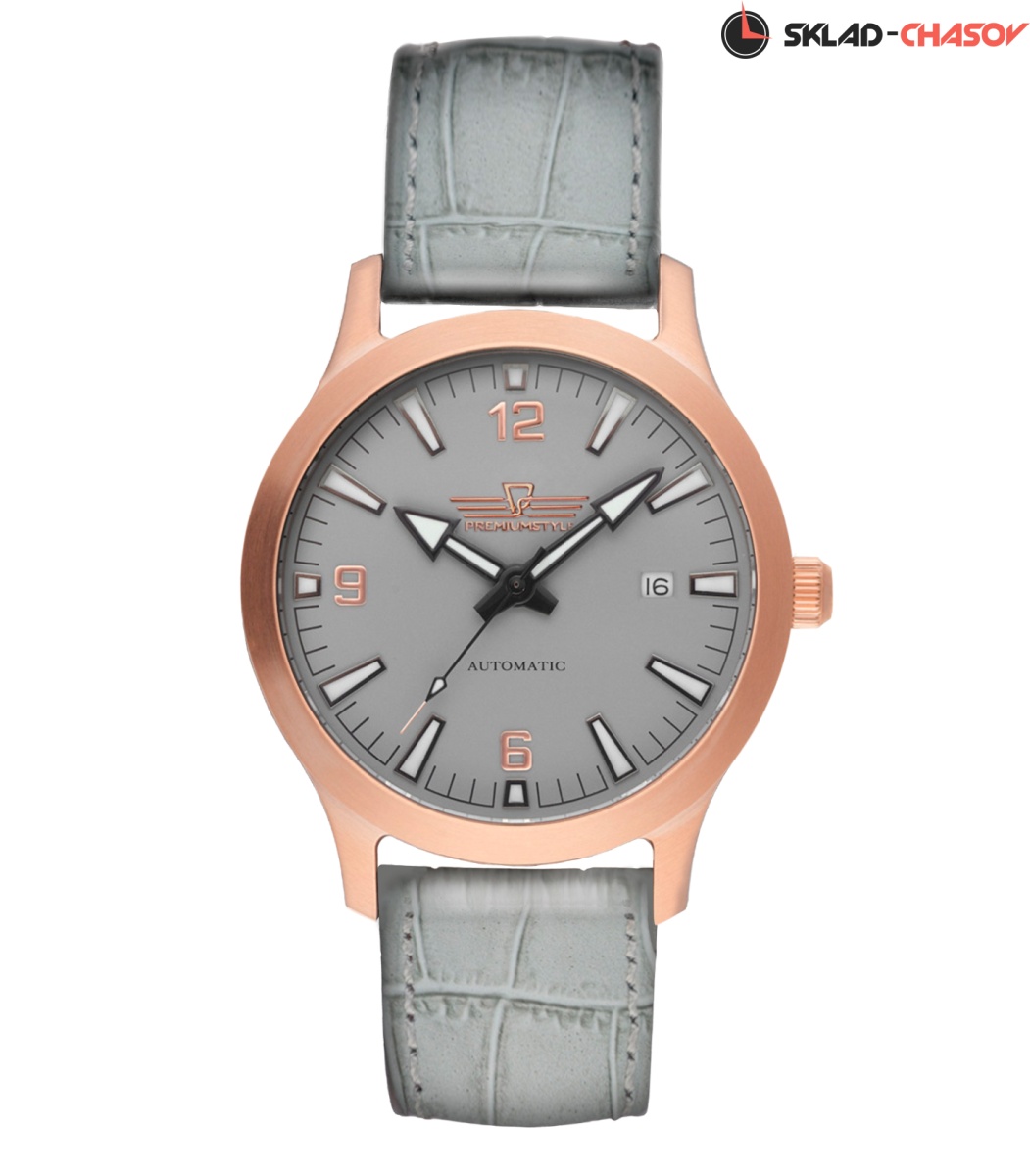 Шлифованная поверхность стального корпуса покрыта розовой позолотой. Задняя крышка часов – стальная, и имеет вставку из минерального стекла, через которую можно наблюдать за работой автоматического механизма японского производства.